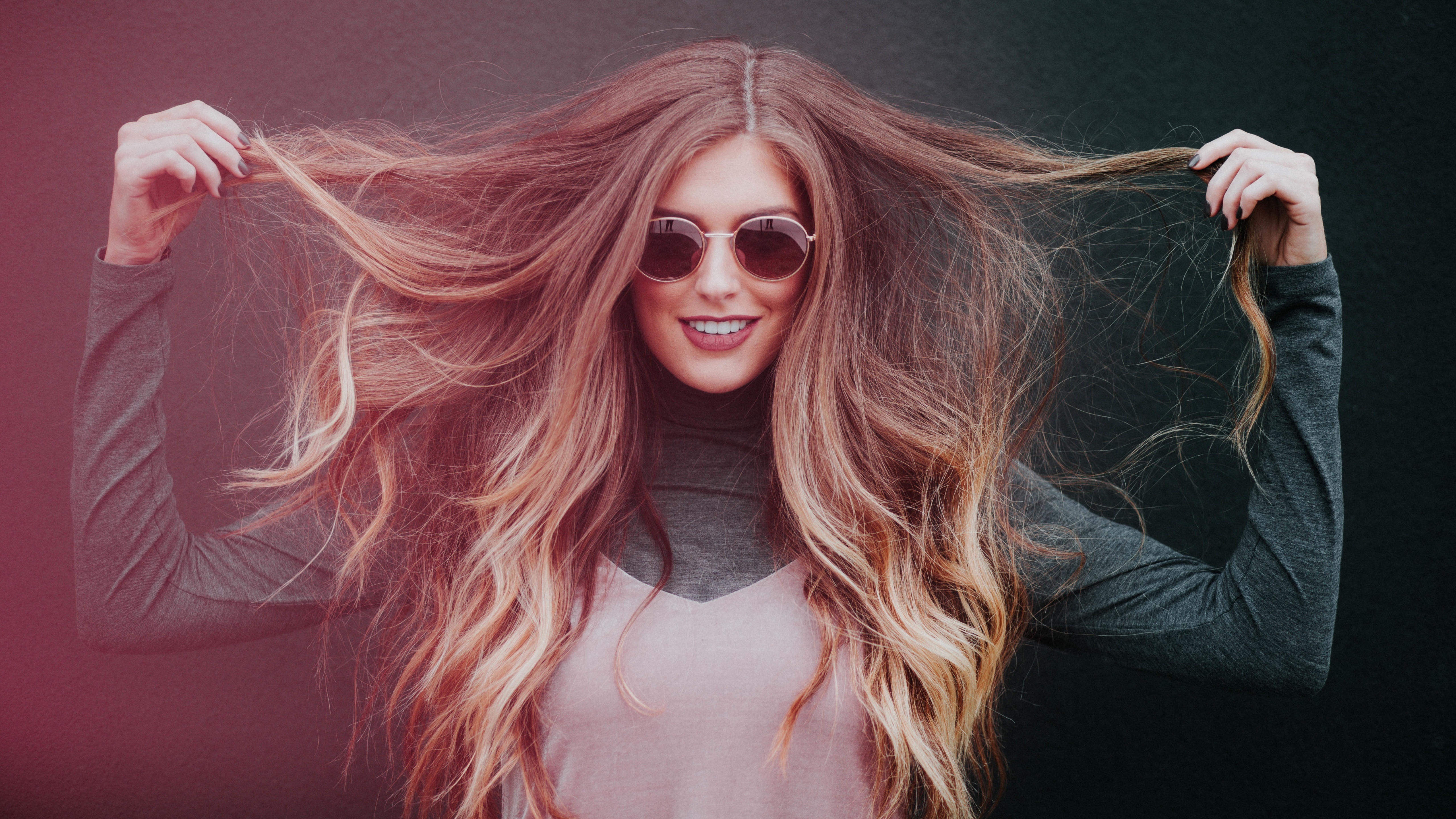 Description: A woman with long hair and sunglasses on her head is smiling and holding her hair in the wind with her hands.