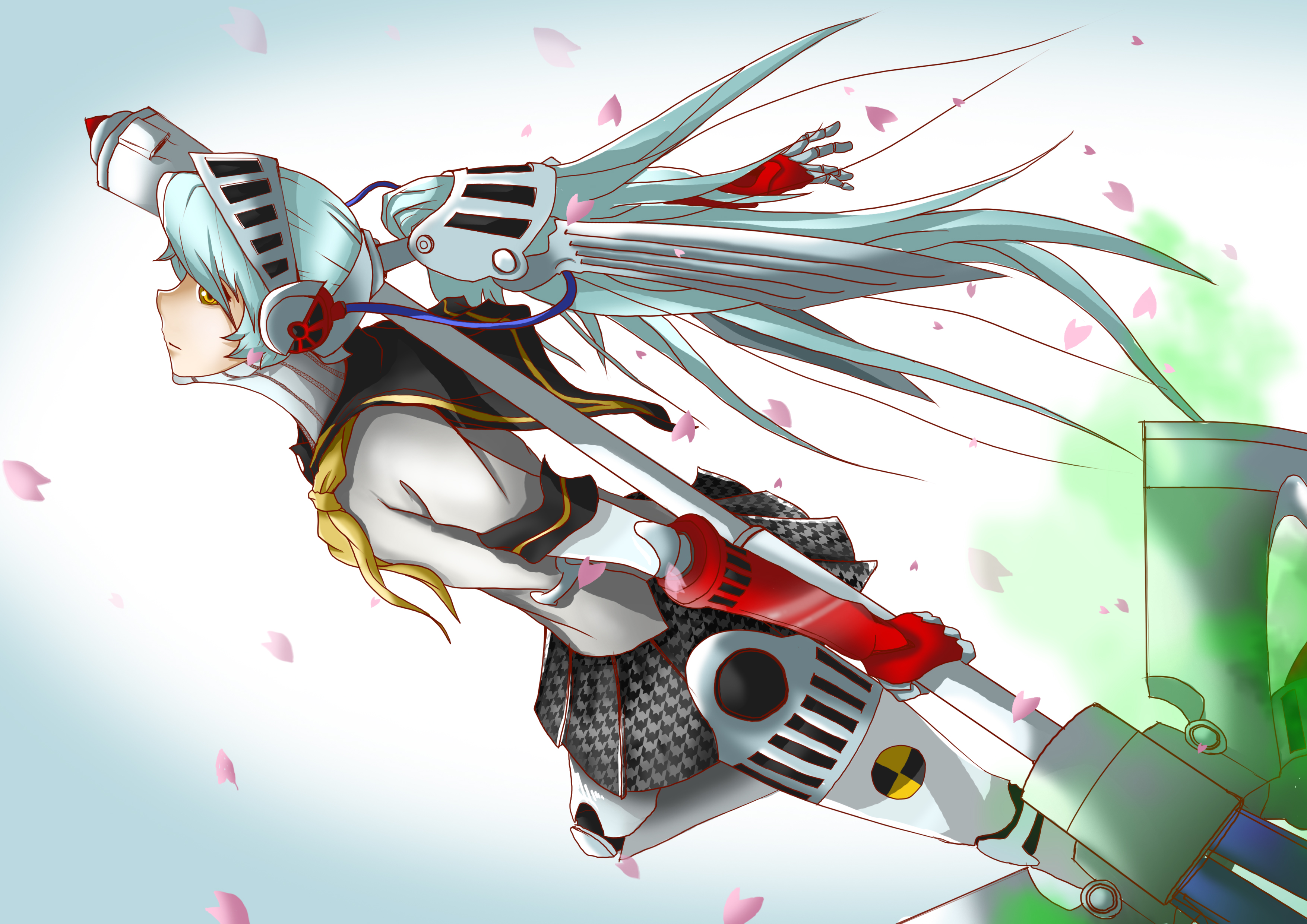 Description: A woman with long hair and a sword in her hand is flying through the air with a green and red object in her hand.