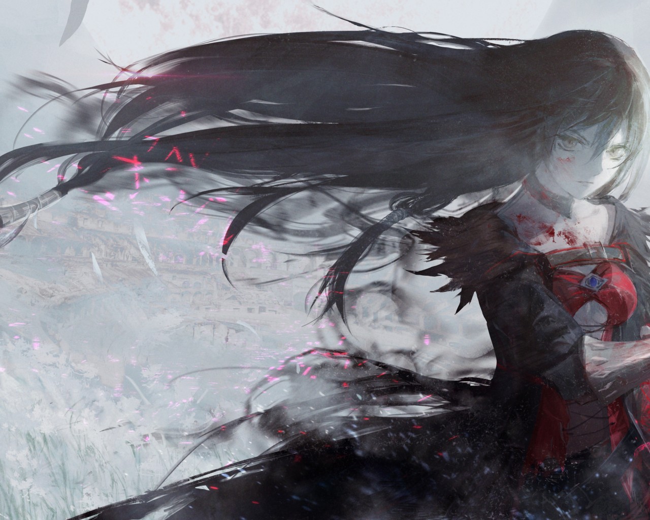 Description: A woman with long hair and a sword in her hand is walking through a field of flowers and grass.