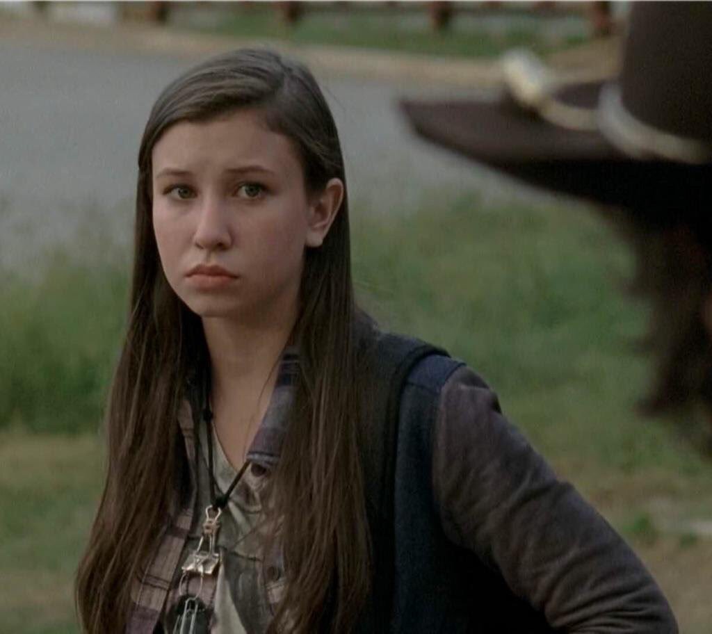 Description: A woman with long hair and a vest on standing in front of a road with a hat on her head.
