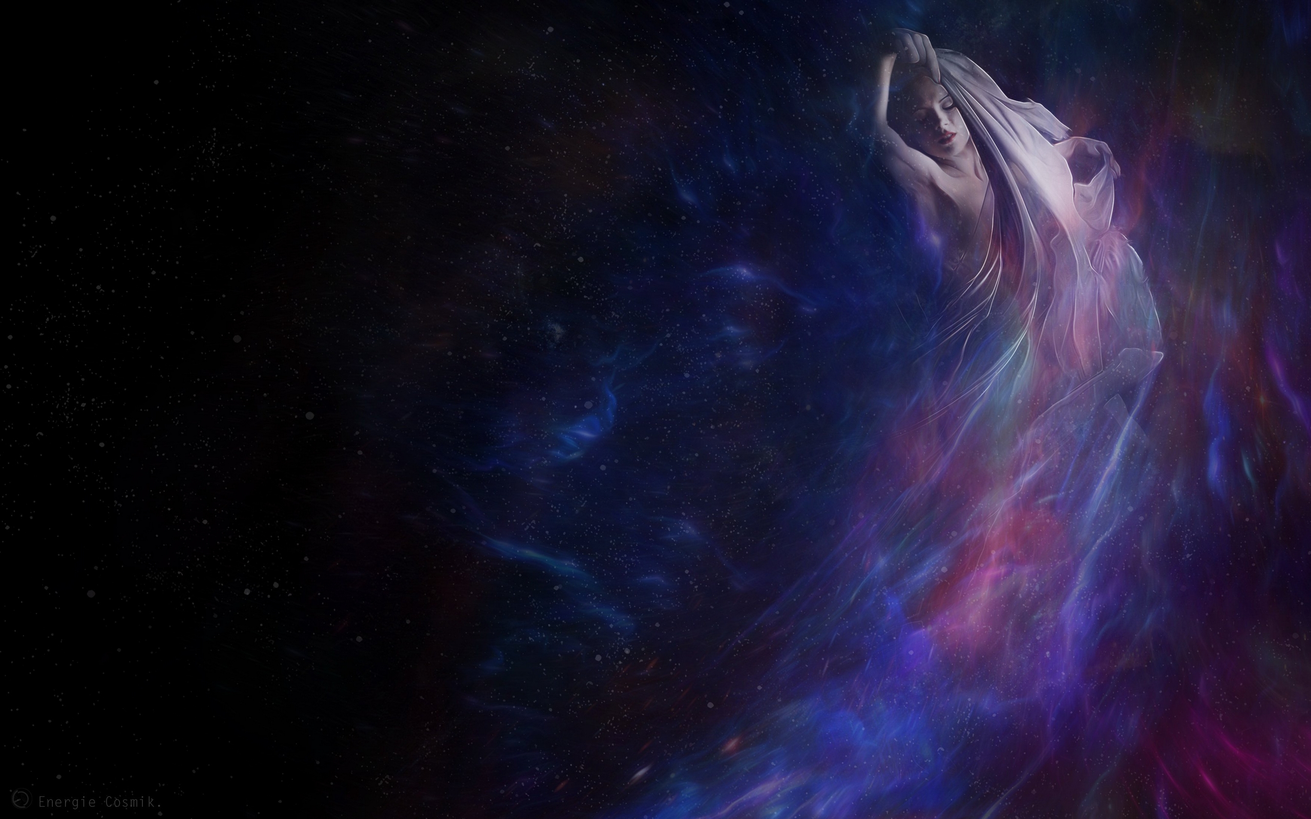 Description: A woman in a long dress with a colorful background and a space background with stars and a blue and pink swirl.
