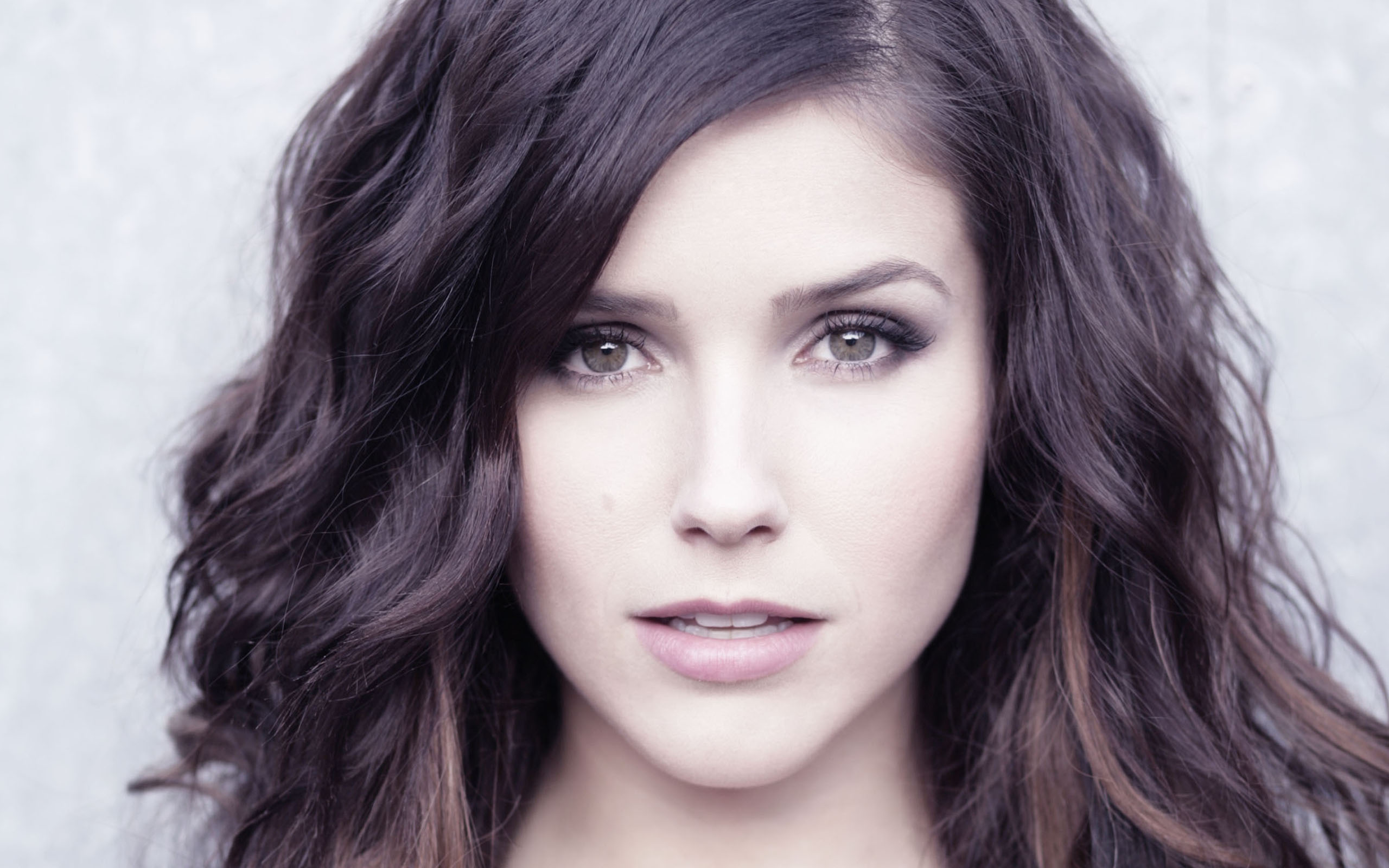 Description: A woman with long hair and a black shirt is posing for a picture with her eyes closed and her hair blowing in the wind.