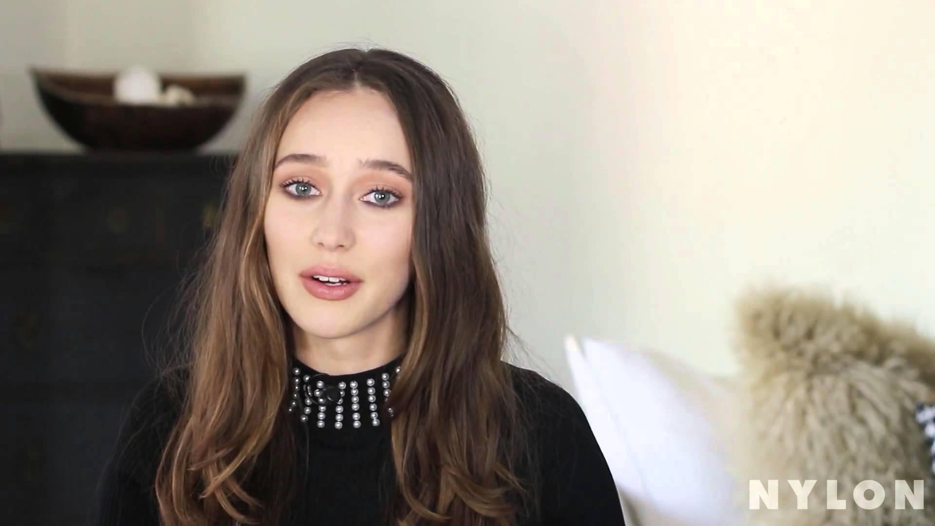 Description: A woman with long hair and a black shirt is looking at the camera and is making a face with her hands.