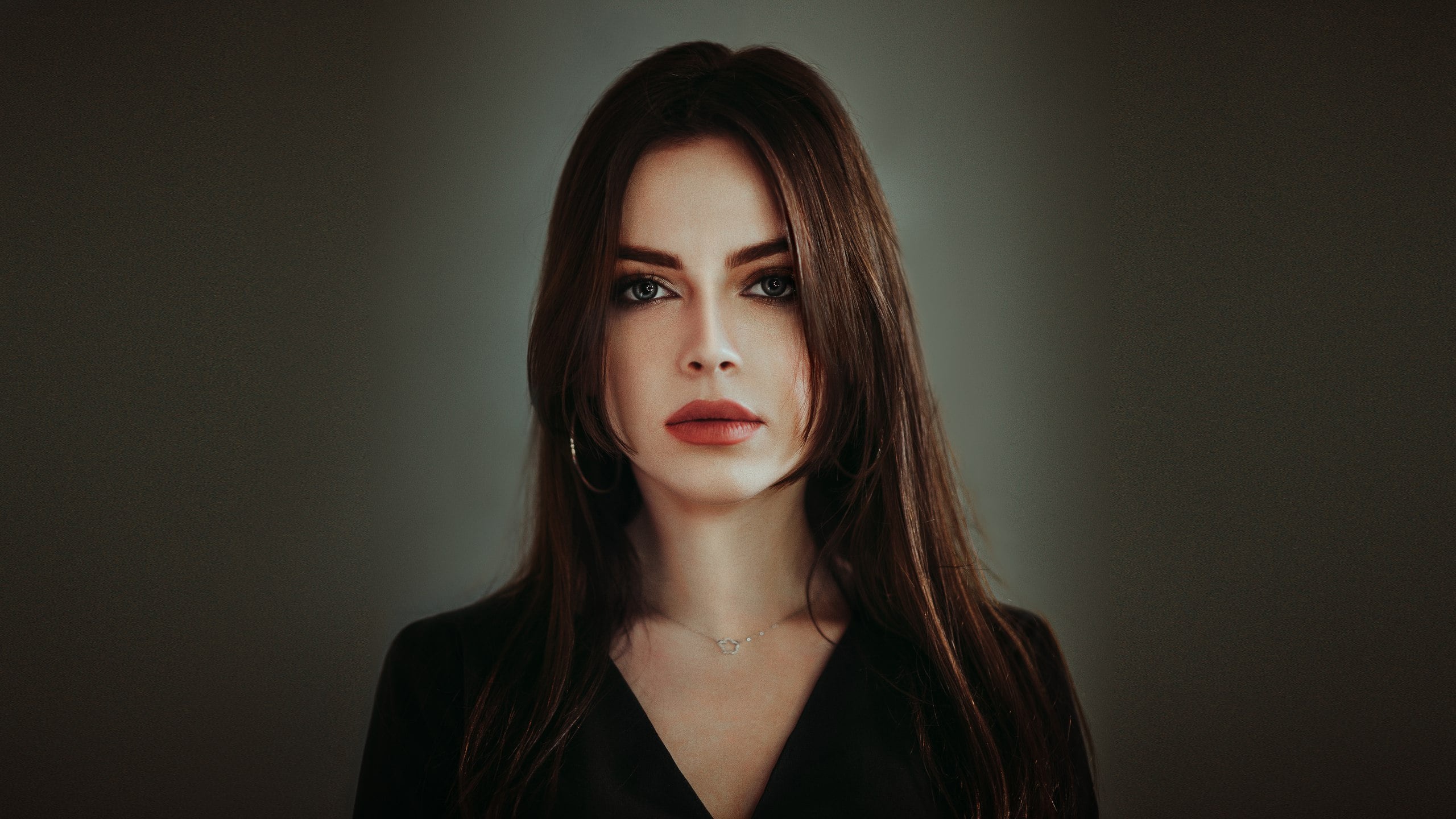 Description: A woman with long hair and a black shirt is posing for a picture with a dark background and a light shining on her face.