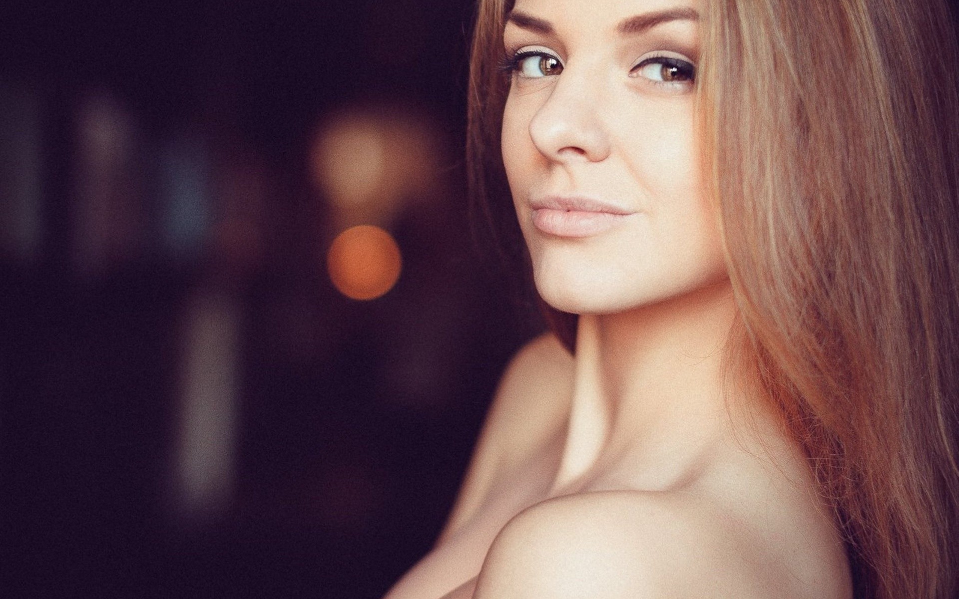 Description: A woman with long hair and a black top posing for a picture with a blurry background of a building.
