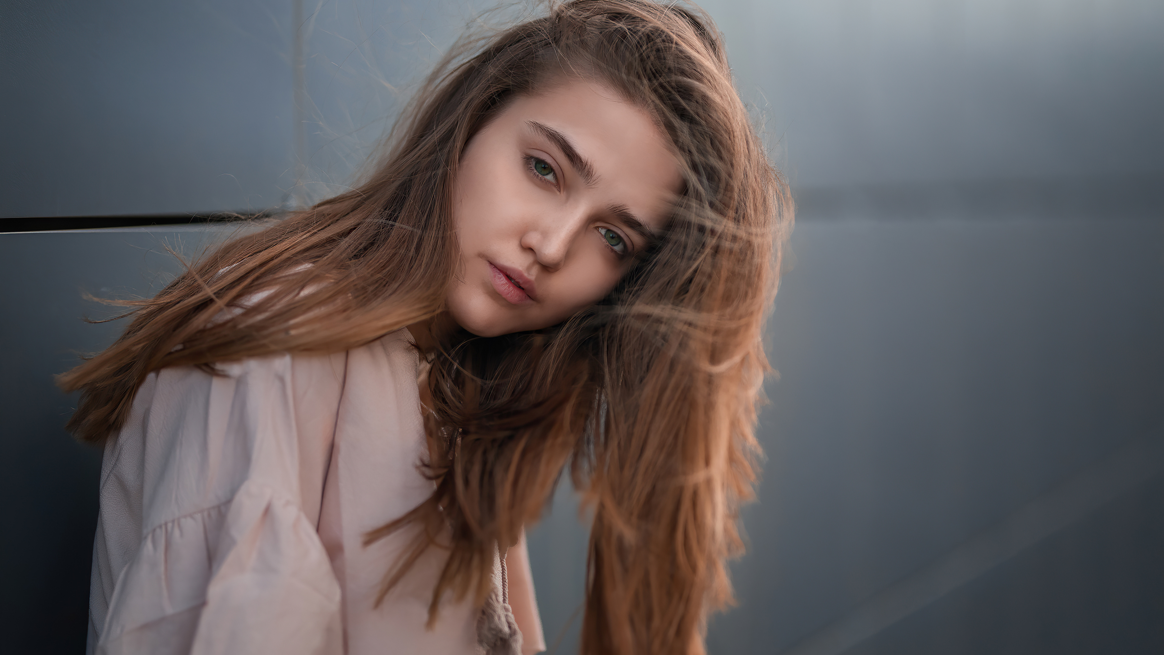 Description: A woman with long hair standing in front of a wall with her hair blowing in the wind and looking at the camera.