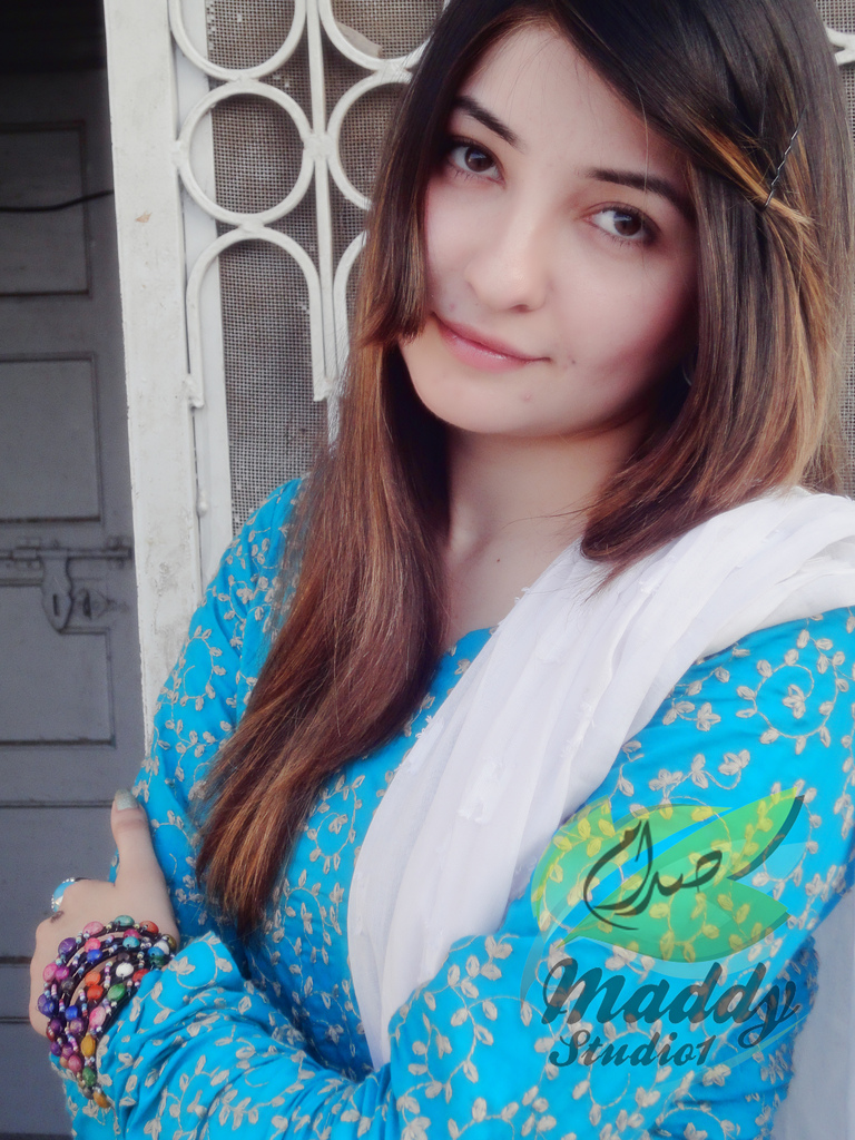 Description: A woman with long hair wearing a blue jacket and a white shirt with a green and yellow design on it.