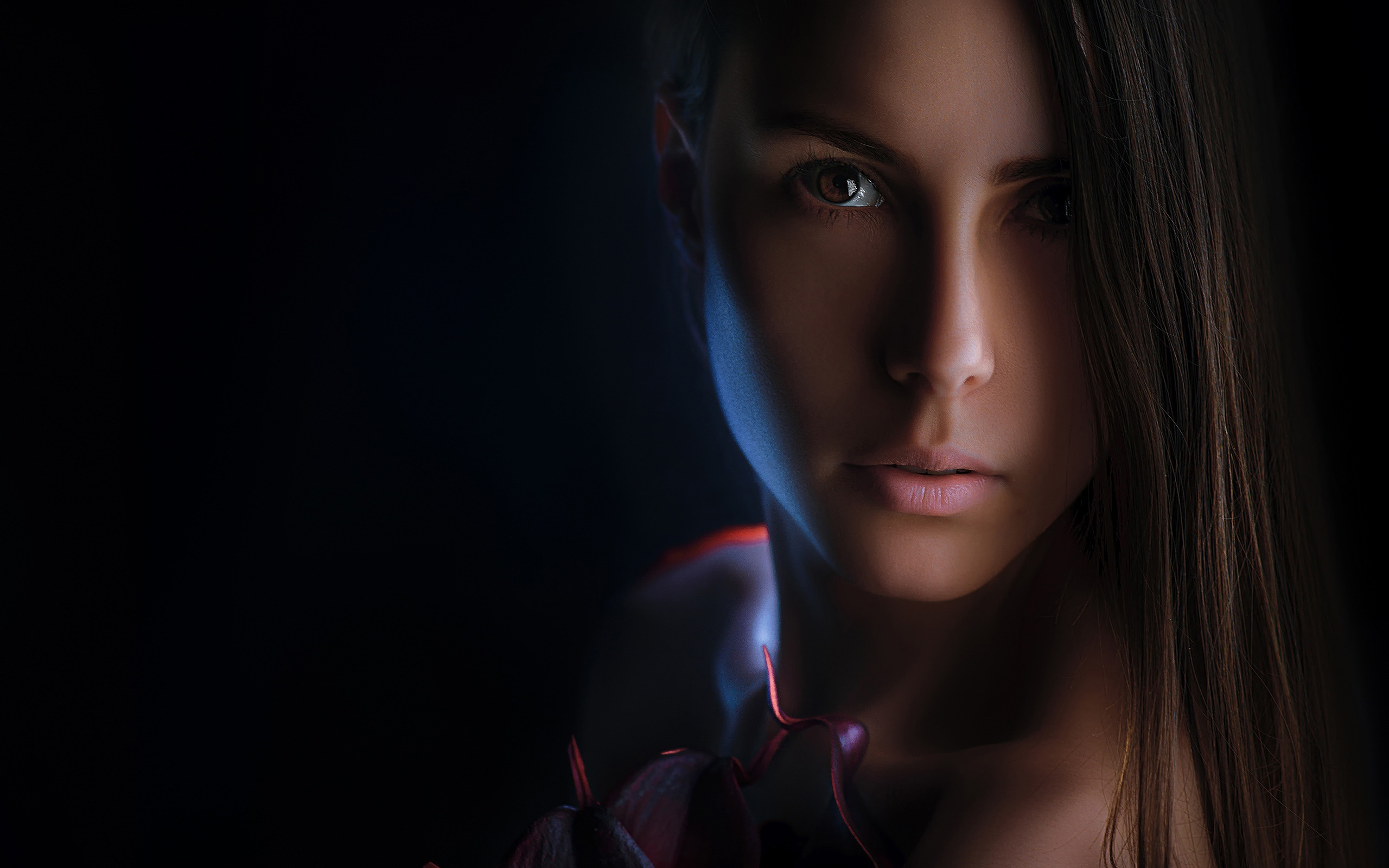 Description: A woman with long hair and a flower in her hand is looking at the camera with a serious look on her face.
