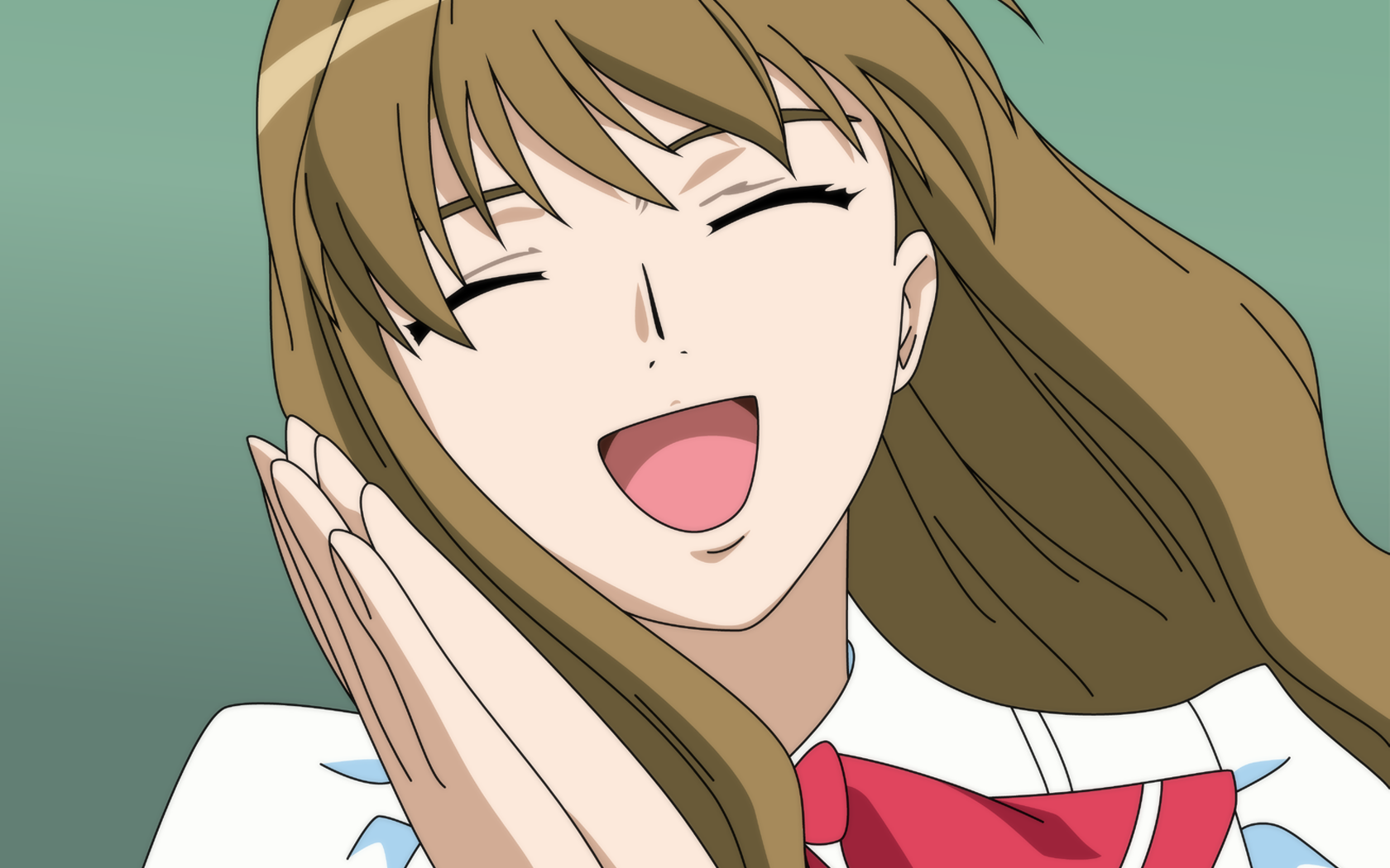 Description: A woman with long hair and a red bow tie making a face with her hands and mouth open and a green background.