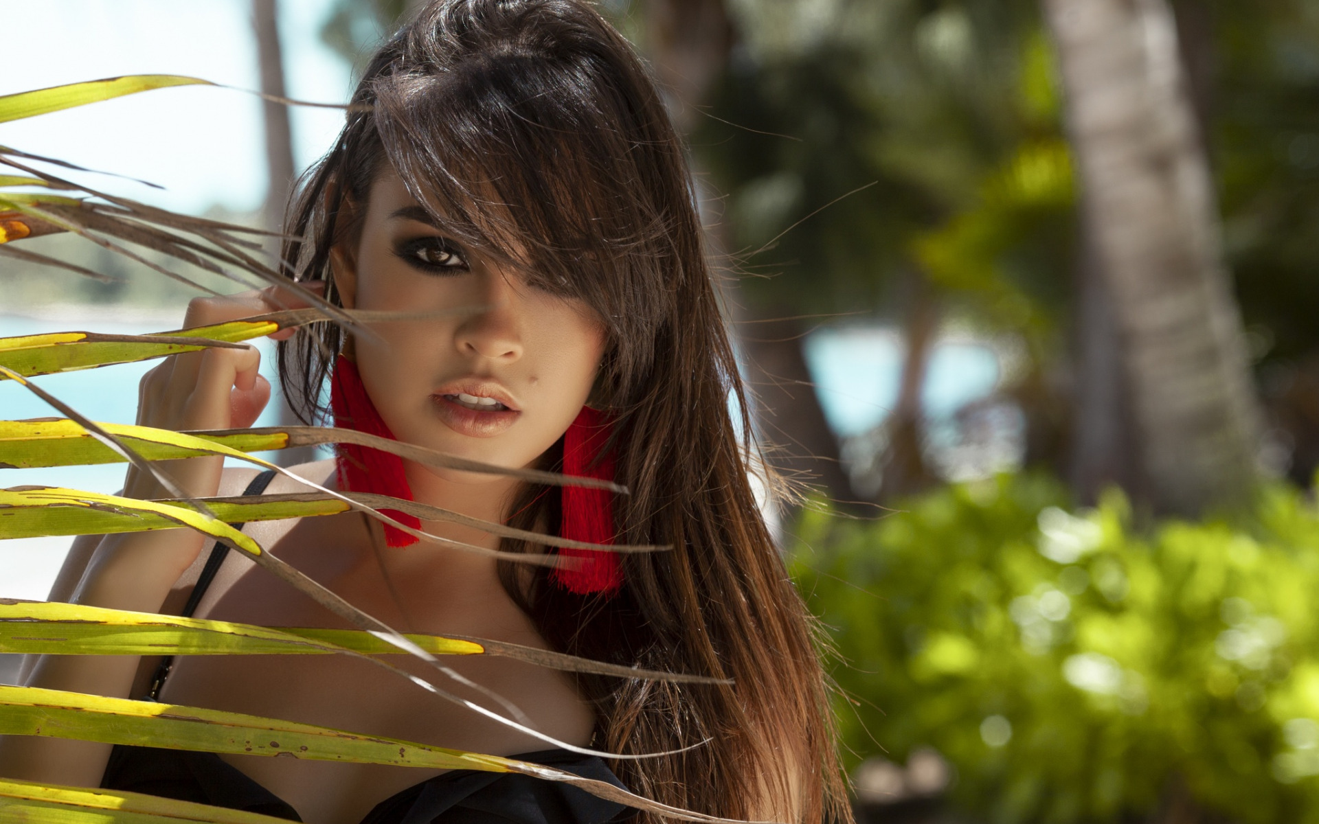 Description: A woman with long hair and red scarf on her head is posing for a picture with palm leaves in the foreground.