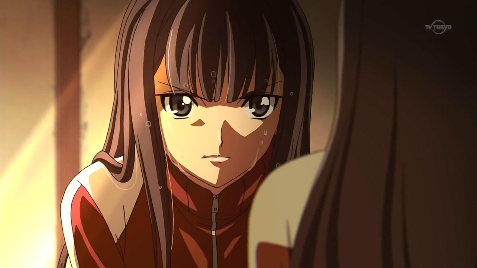 Description: A woman with long hair and a red shirt is staring at something in the distance with a serious look on her face.