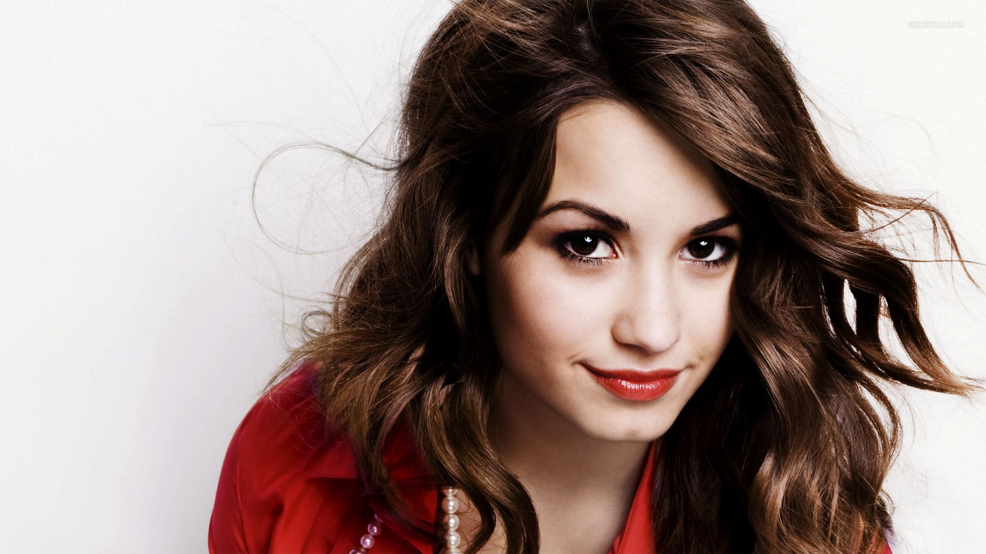 Description: A woman with long hair and a red shirt on posing for a picture with her hair blowing in the wind.