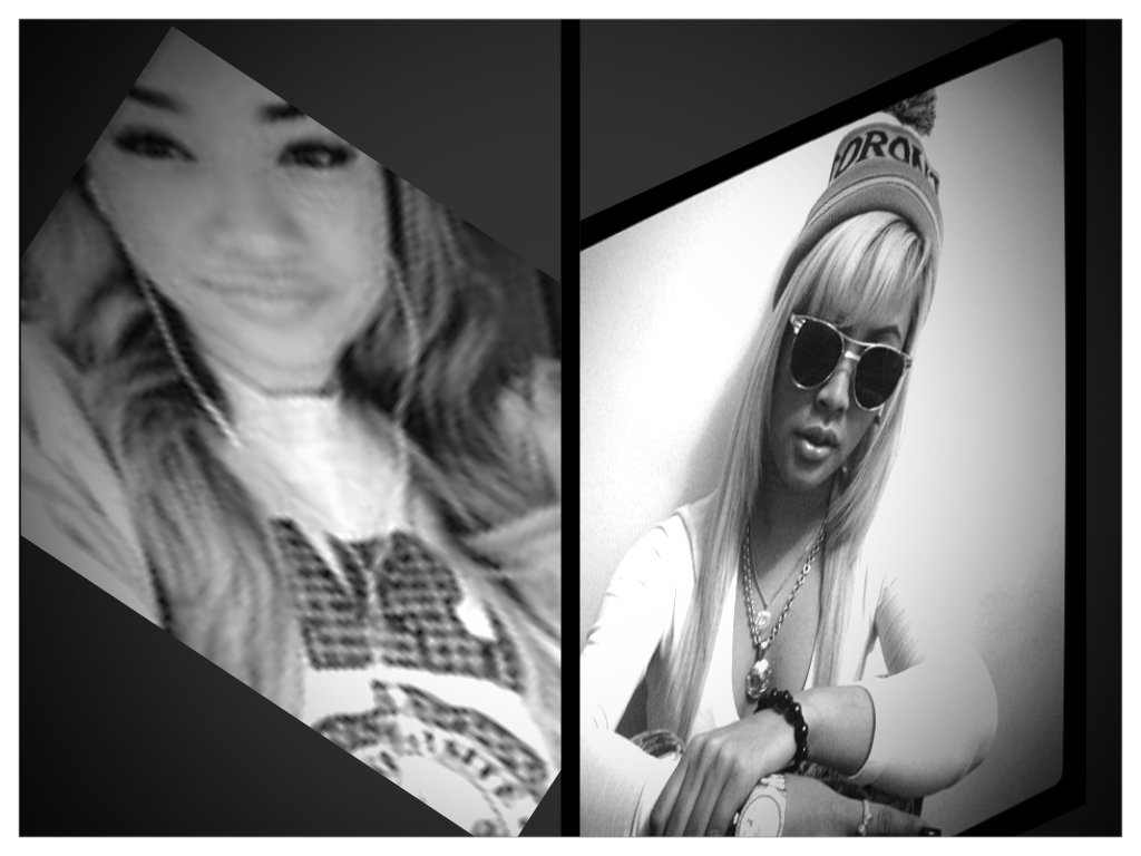 Description: A woman with long hair and sunglasses on a black and white photo and a picture of herself with sunglasses on.