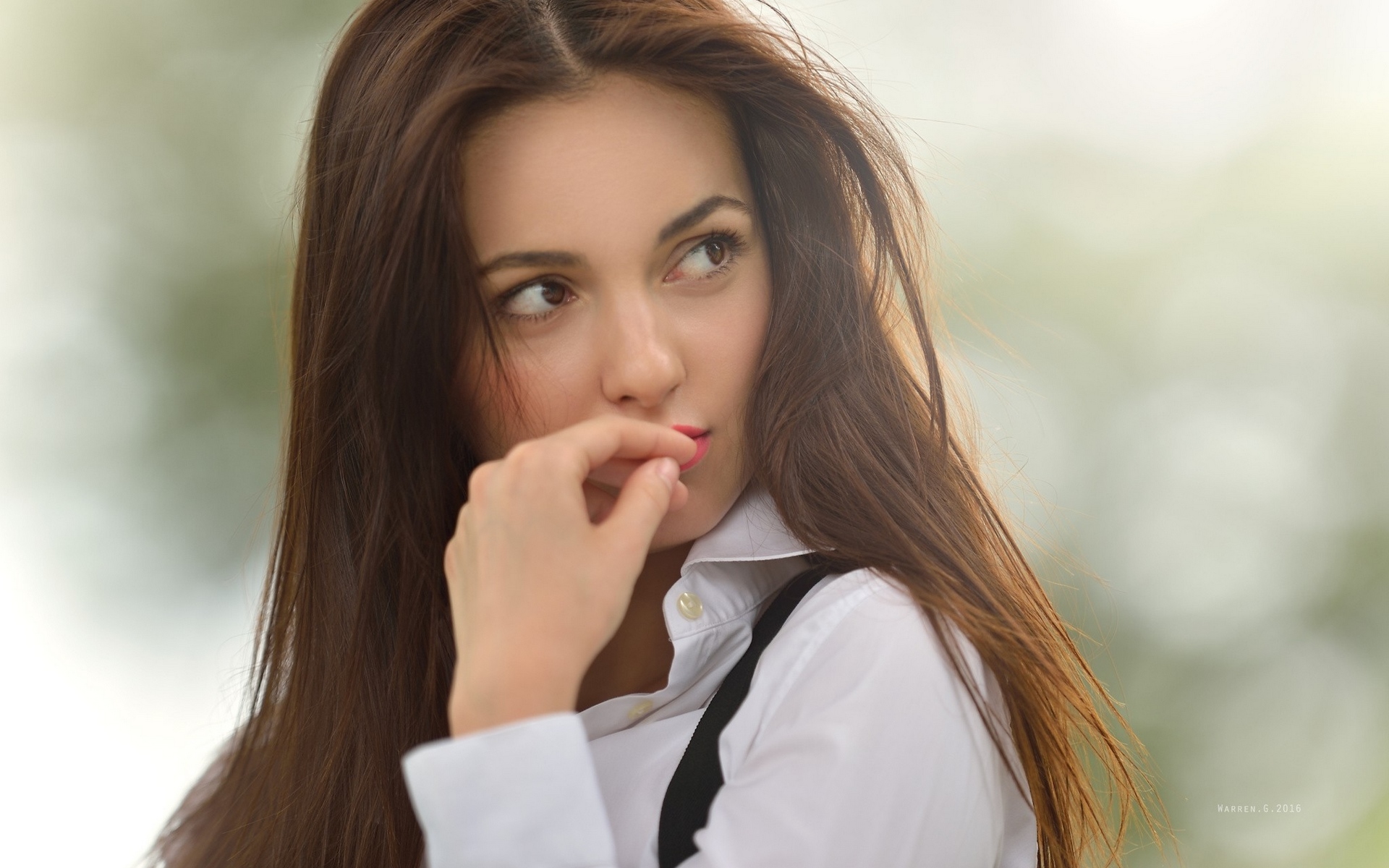 Description: A woman with long hair and a tie on posing for a picture with her hand on her chin and looking at the camera.