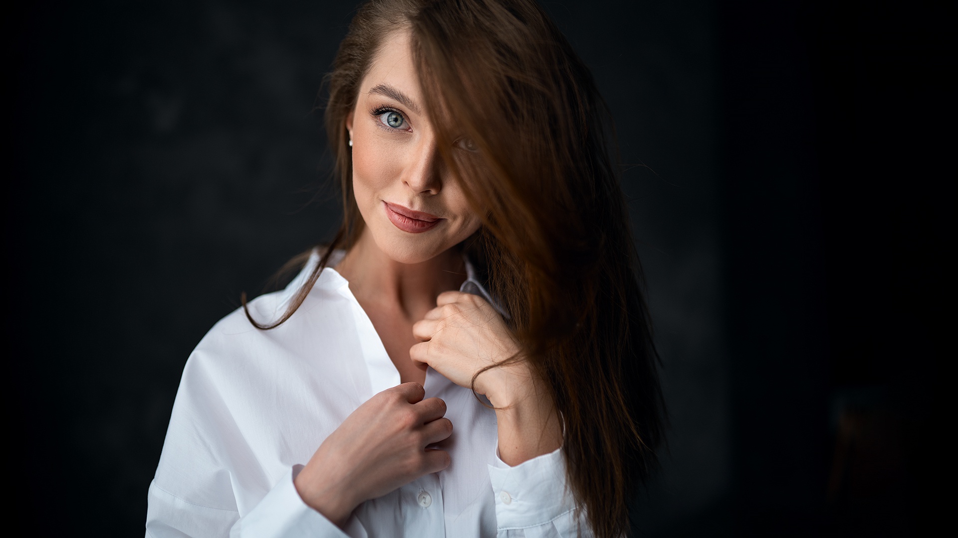 Description: A woman with long hair wearing a white shirt and a necklace on her neck and a black background with a black backdrop.