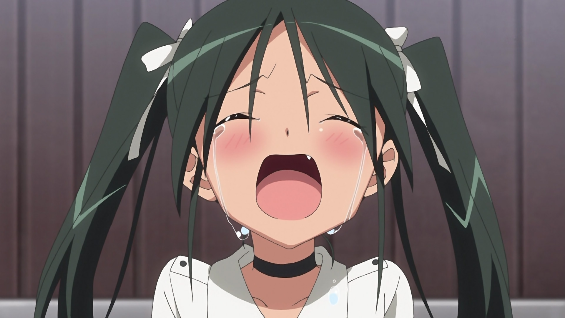 Description: A woman with long hair and a white shirt is making a face with her mouth open and her tongue out.