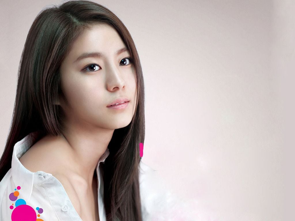 Description: A woman with long hair and a white shirt on posing for a picture with a pink background and a pink flower.