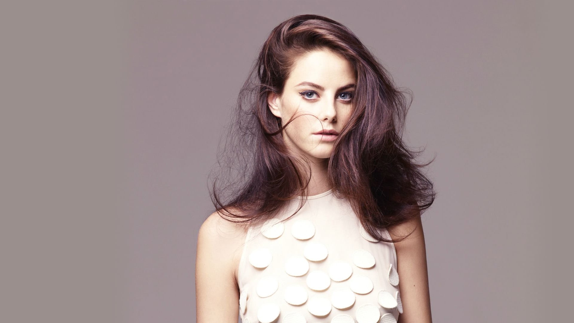 Description: A woman with long hair and a white dress on a gray background with a shadow of her face and her hair in the air.