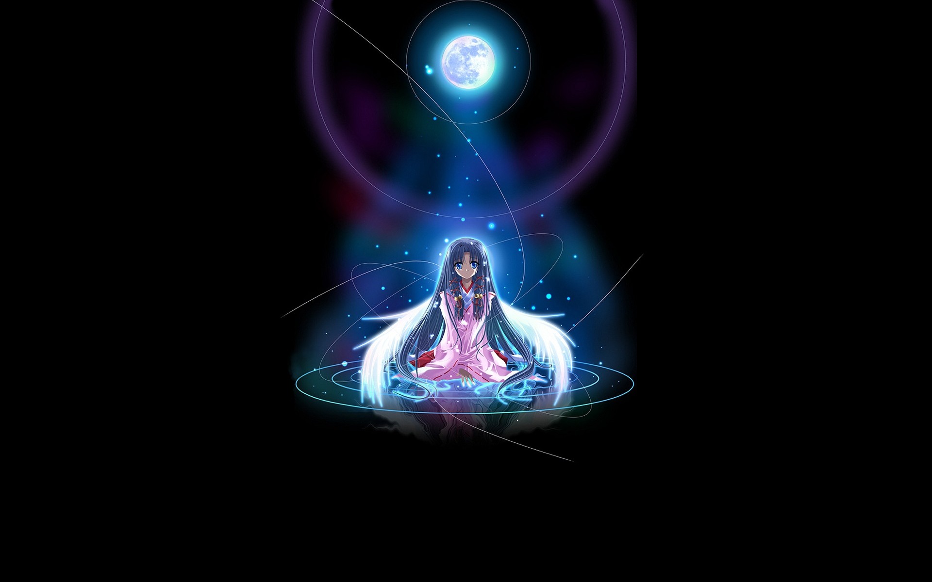 Description: A woman sitting in a lotus position with a light shining on her face and hands in the air.