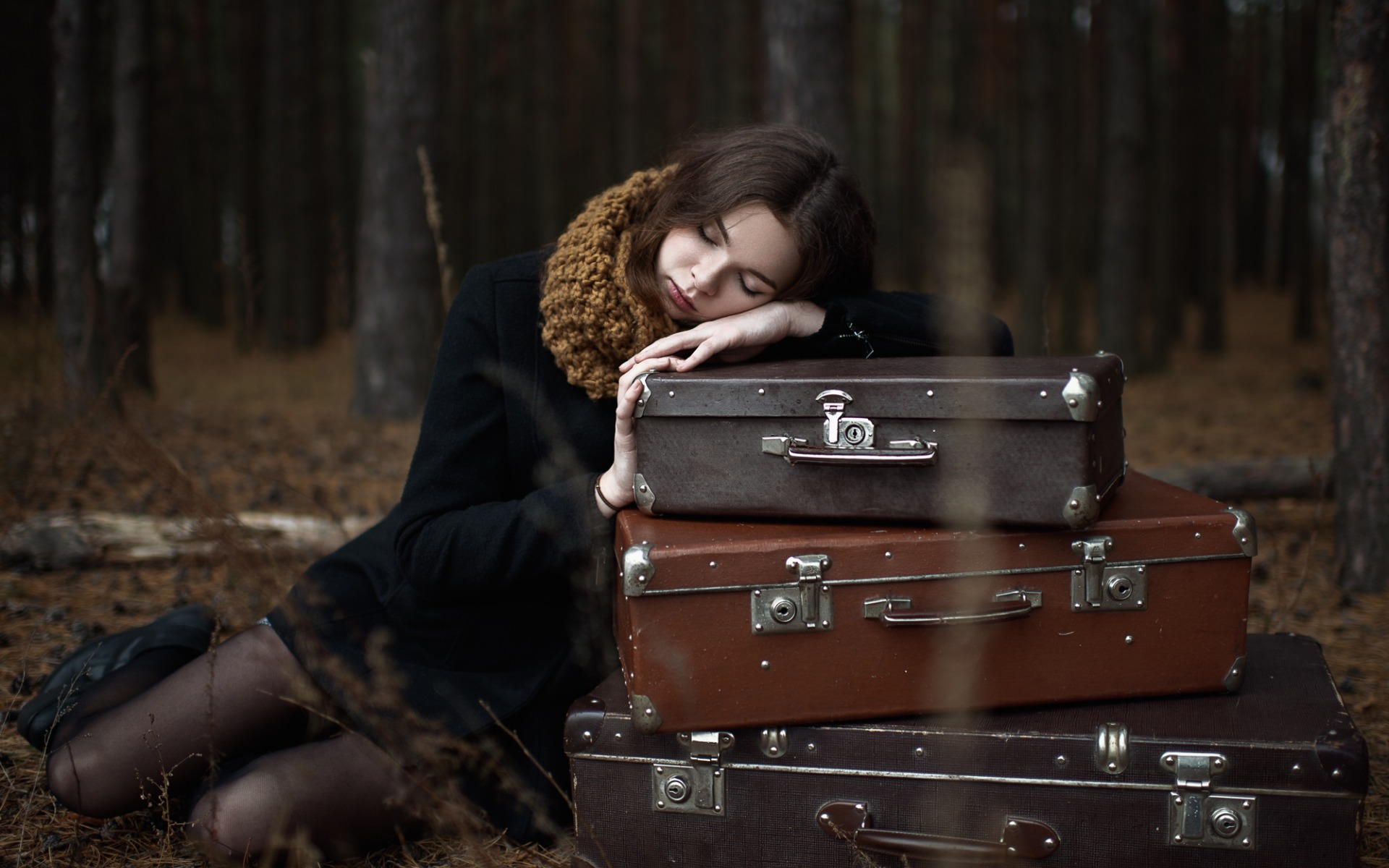 Description: A woman sitting on the ground with a stack of luggage in front of her face and a teddy bear behind her.