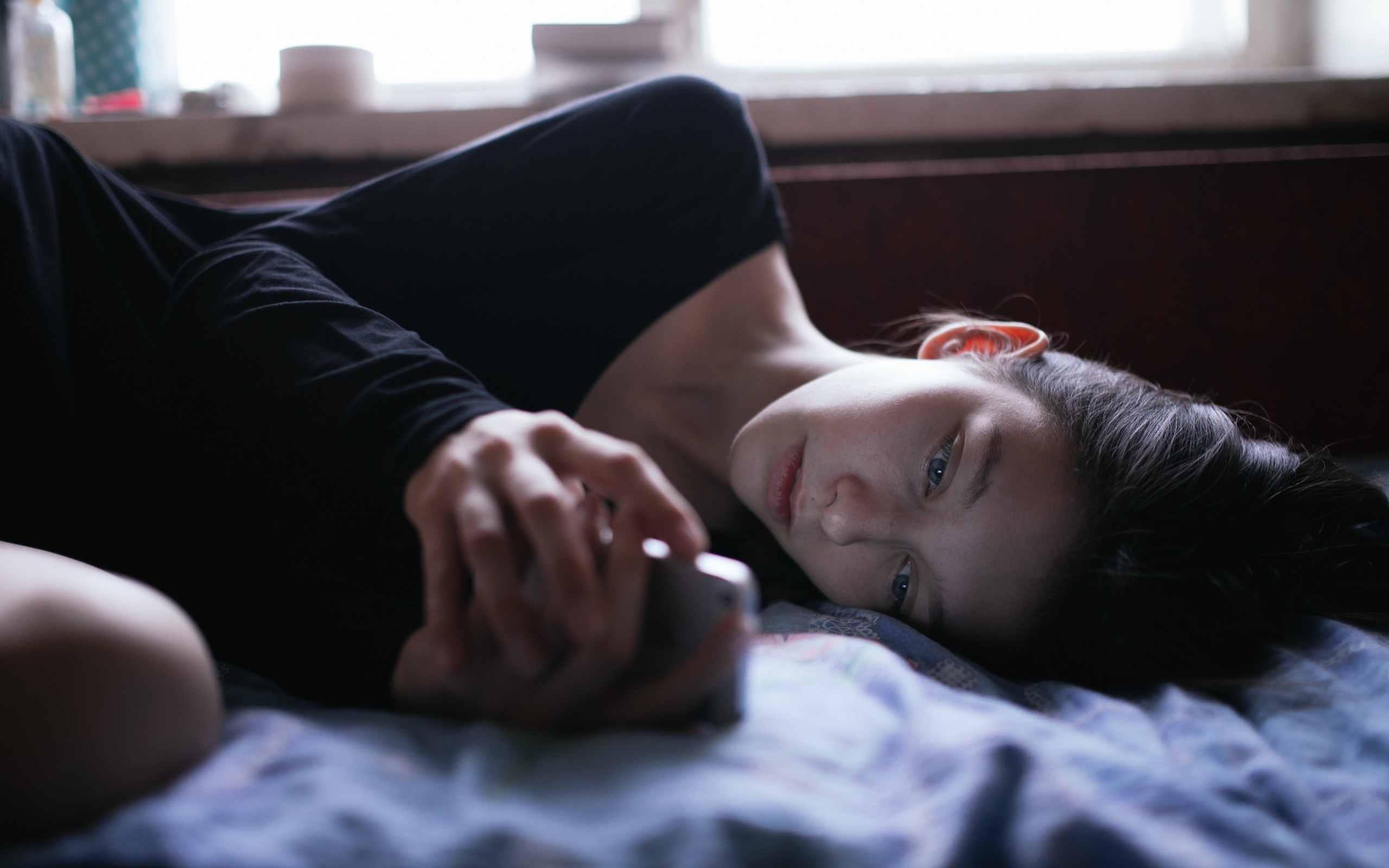 Description: A woman laying on a bed holding a cell phone in her hand and looking at the camera with a serious look on her face.