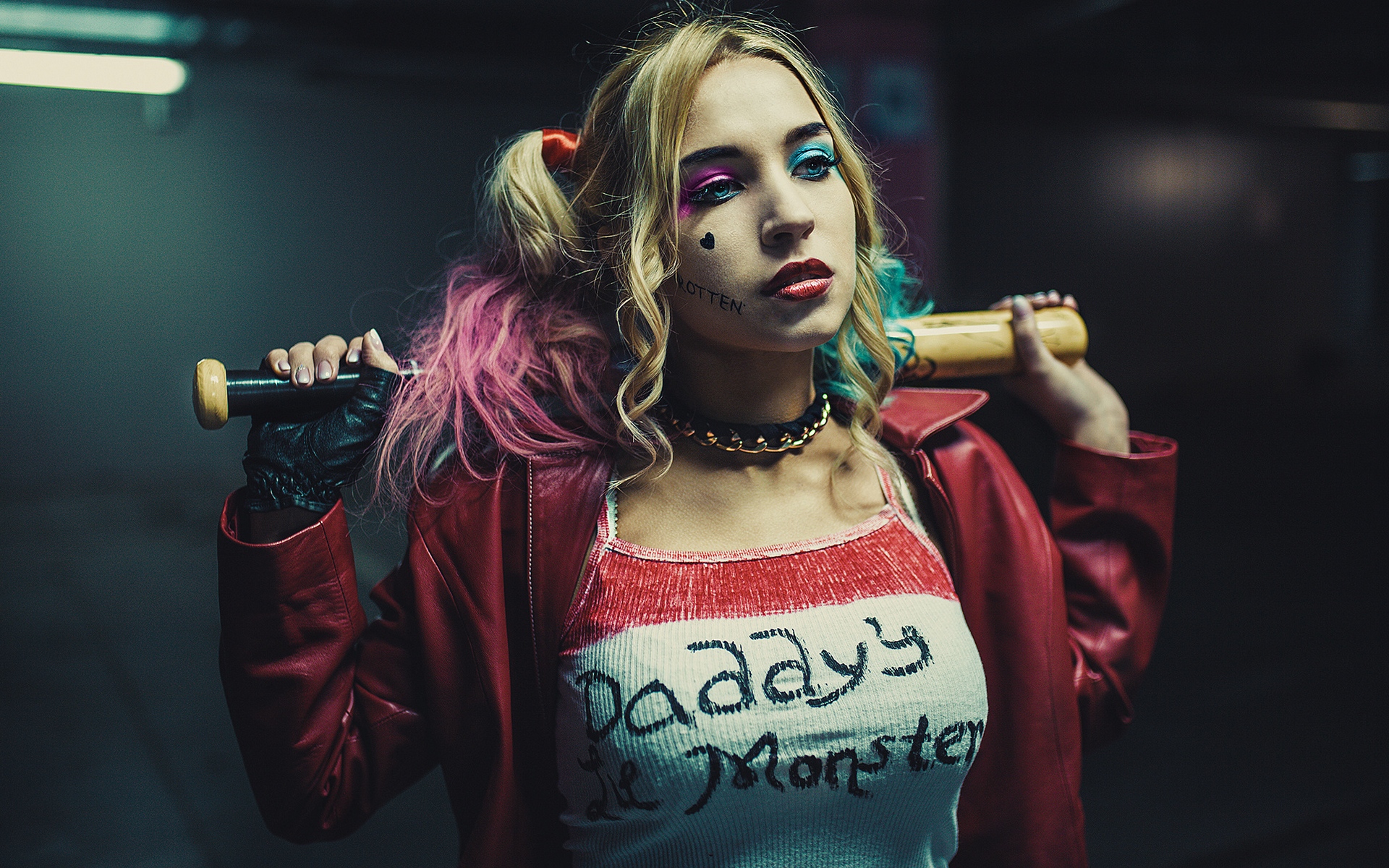 Description: A woman with makeup and a baseball bat in her hand and a red jacket on her shoulders and a name on her shirt.