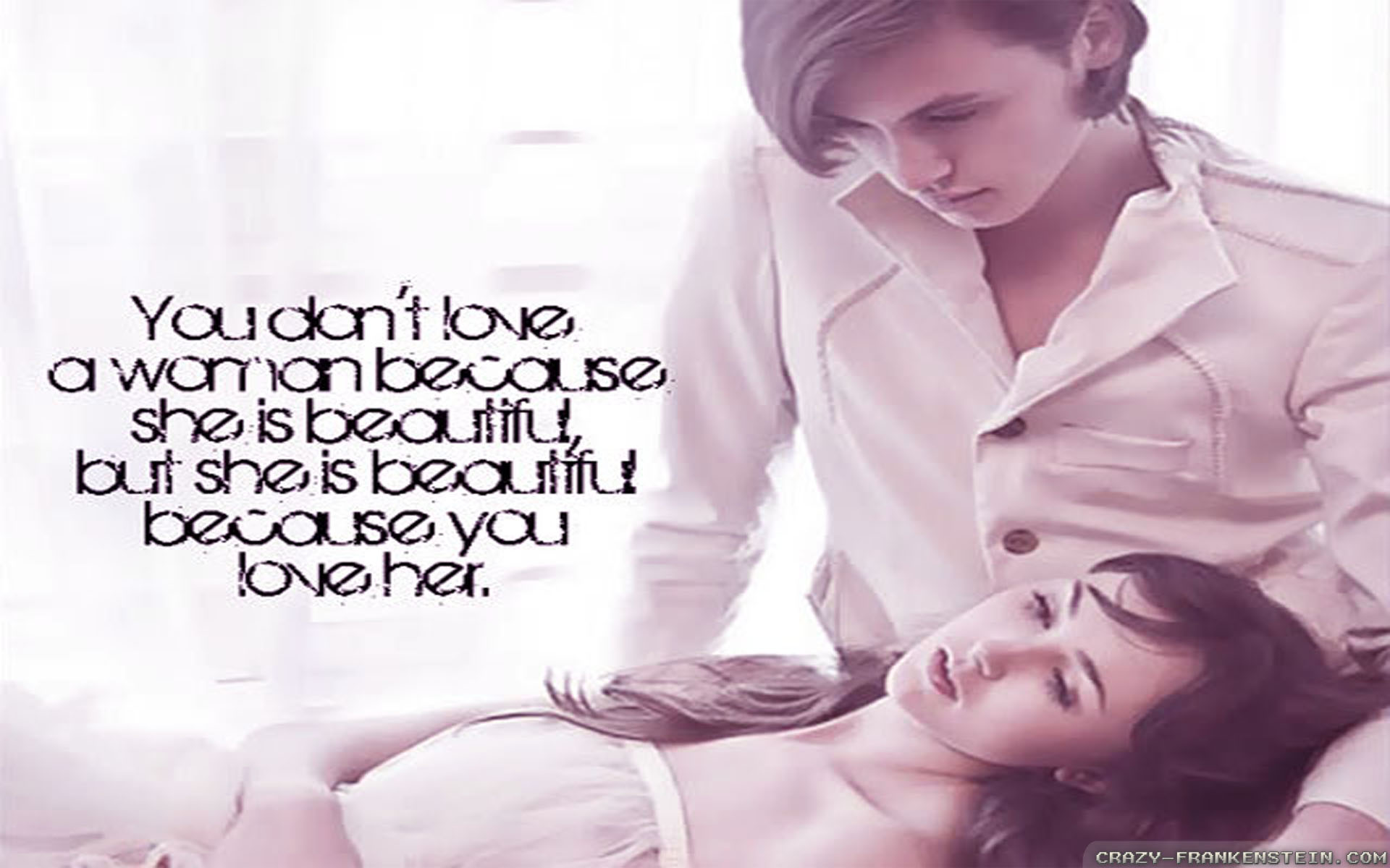 Description: A woman laying on a bed next to a man with a white shirt on and a quote on the back of the image.