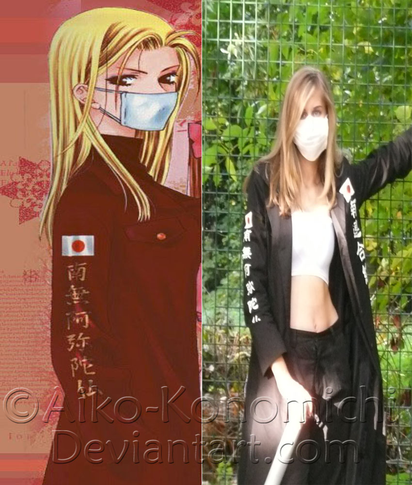 Description: A woman wearing a mask and a jacket with a face mask on her face and a picture of a woman with a mask on her face.