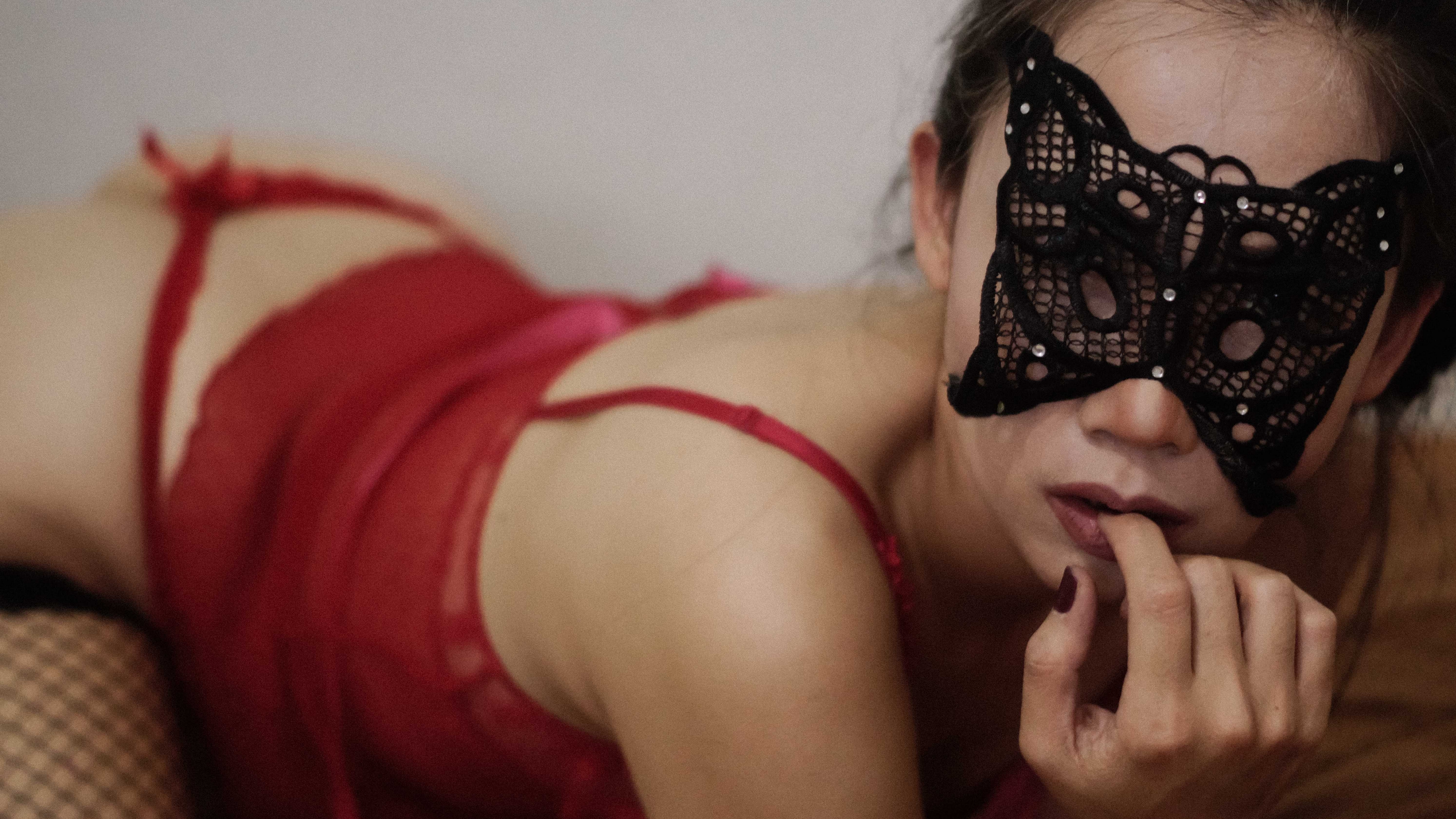 Description: A woman wearing a black mask and red dress laying on a bed with her hand under her chin and her hand under her chin.