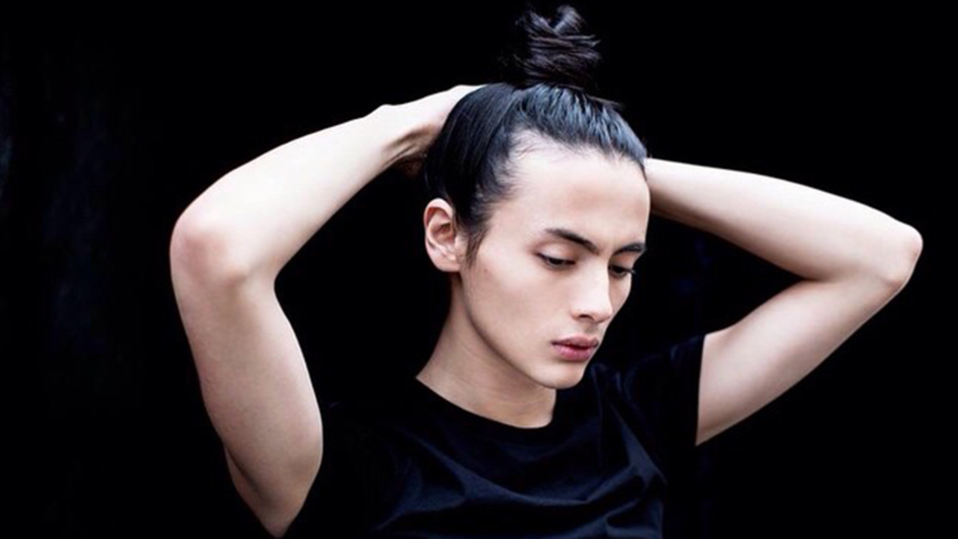 Description: A woman with a messy top knoted into her hair is looking down at her hairline and is holding her head.