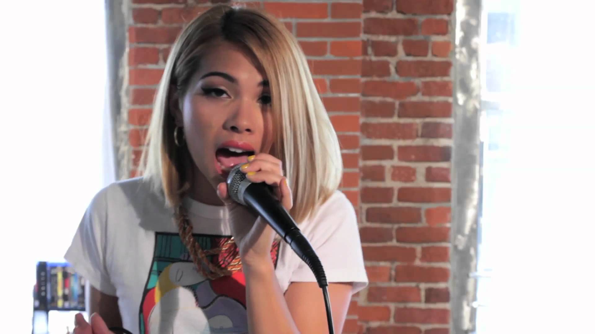 Description: A woman with a microphone in her hand and a brick wall behind her is making a face and a brick wall behind her is a window.