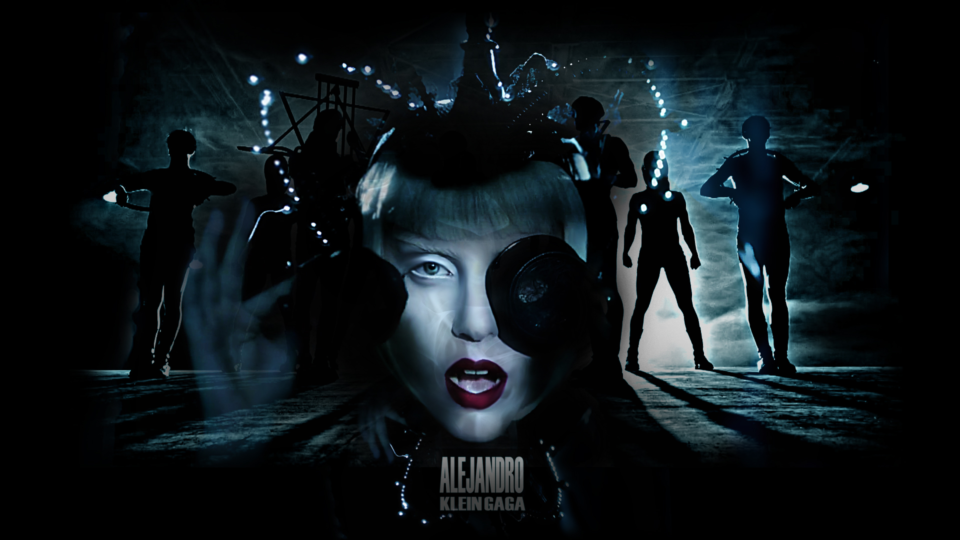 Description: A woman with a microphone in front of a group of people with lights on her head and a man with a gun in his hand.