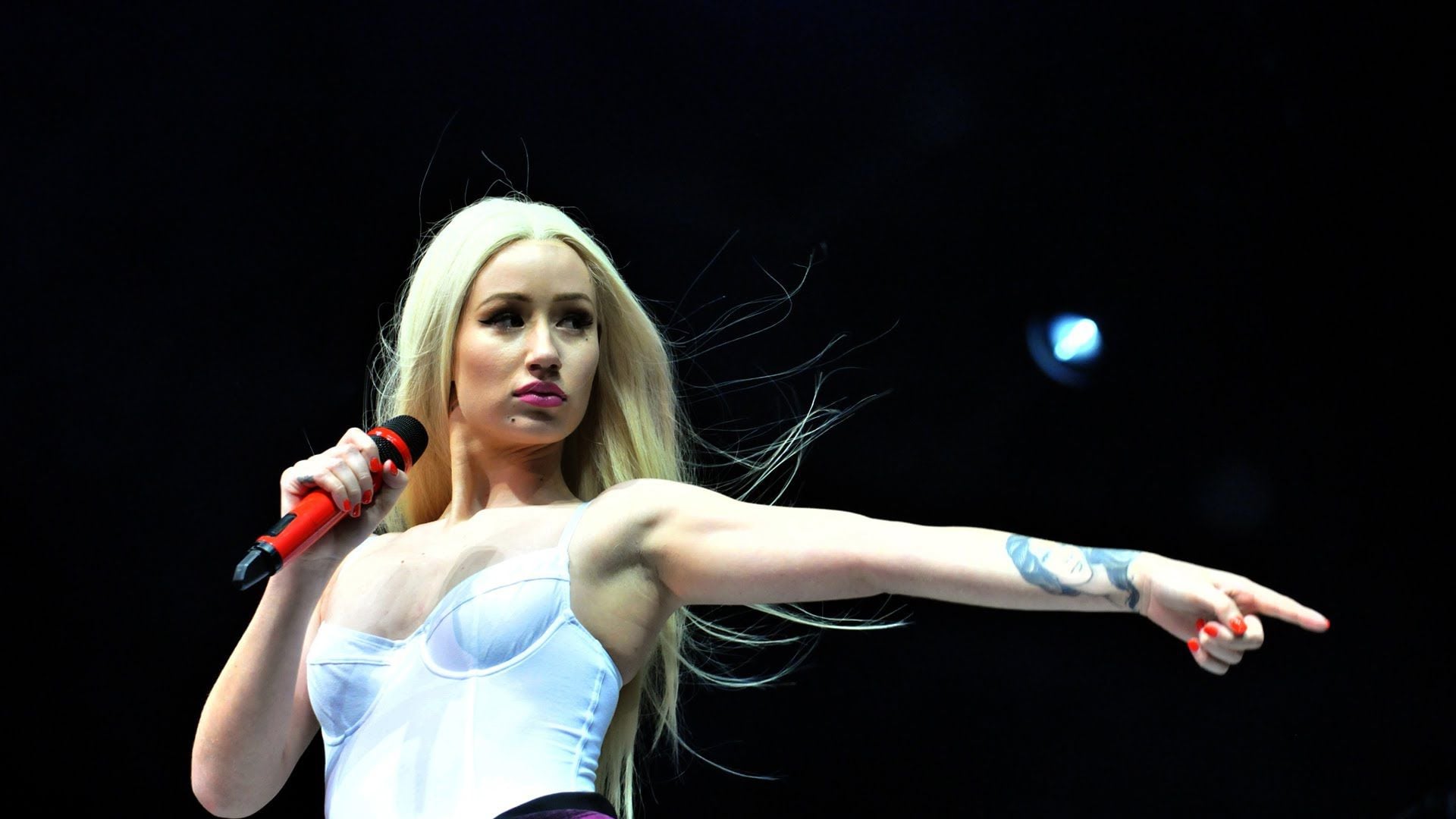 Description: A woman with a microphone on stage with a microphone in her hand and a microphone in her other hand.
