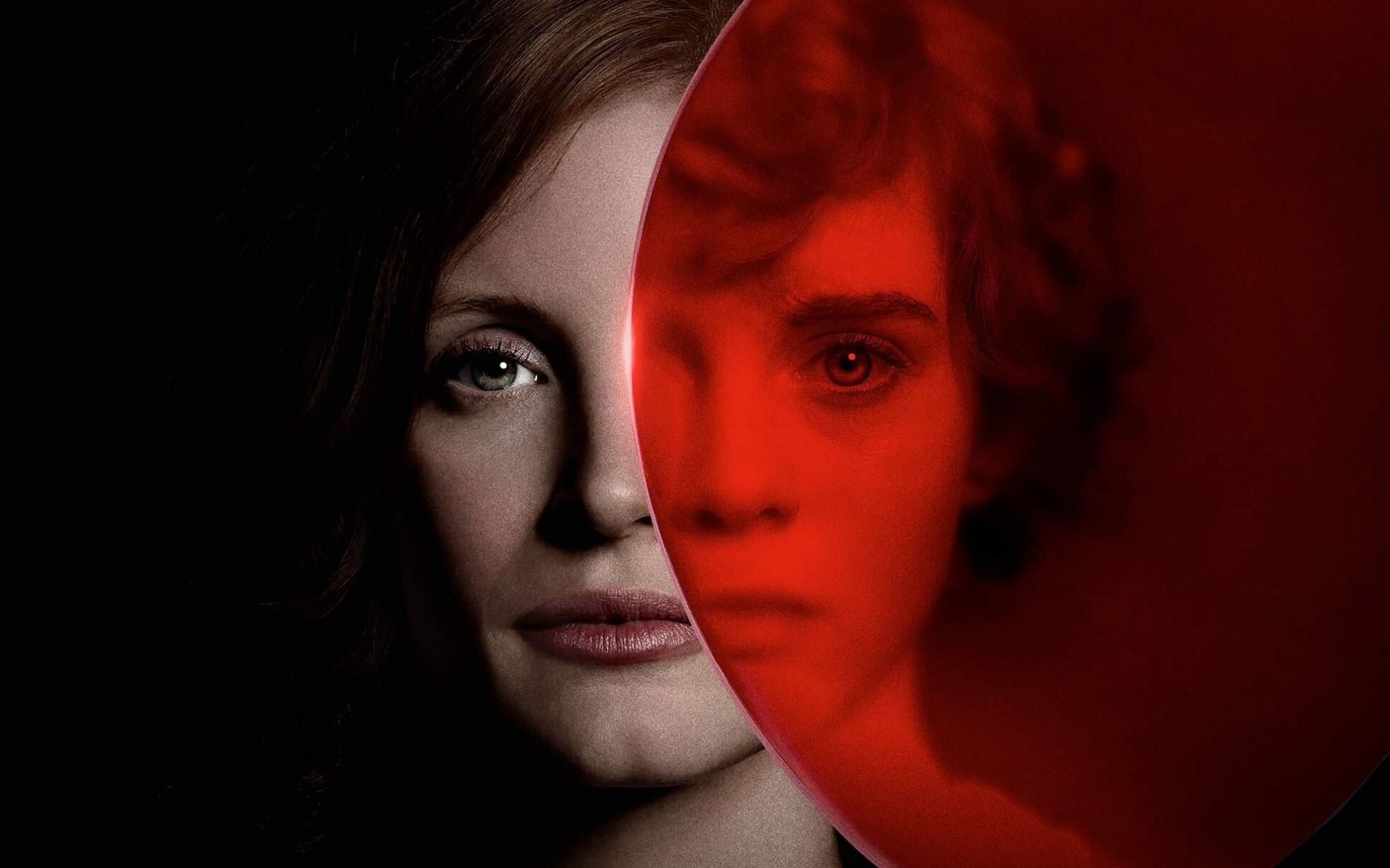 Description: A woman looking at herself in a mirror with a red light on her face and a black background with a red circle.