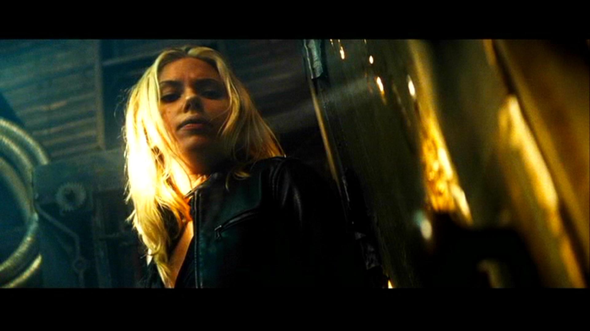 Description: A woman standing in front of a mirror in a room with a clock on it's wall and a man in the background.