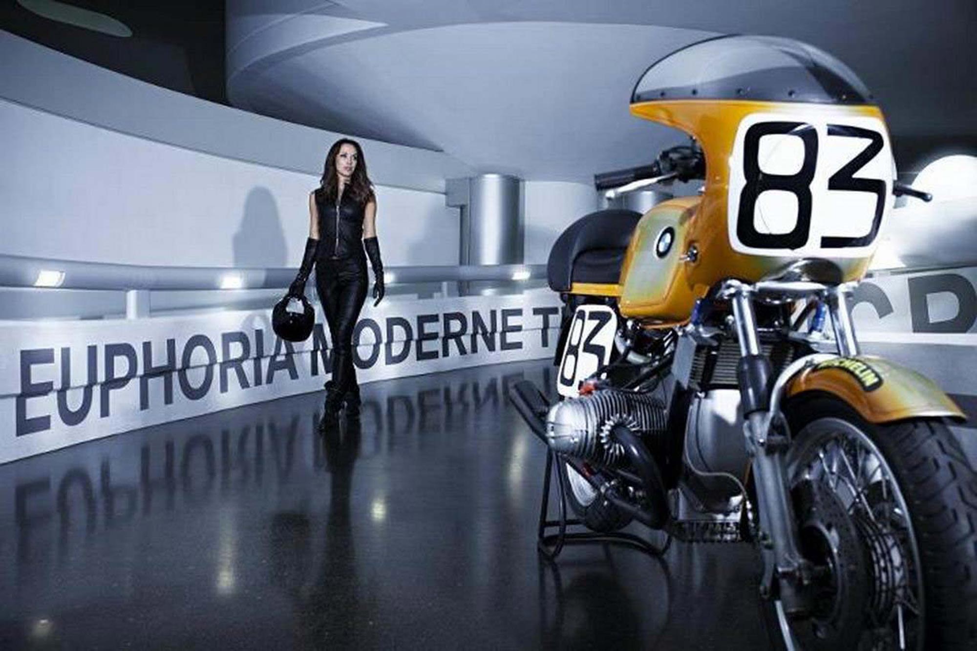 Description: A woman standing next to a motorcycle in a building with a sign behind it that says'82 '.