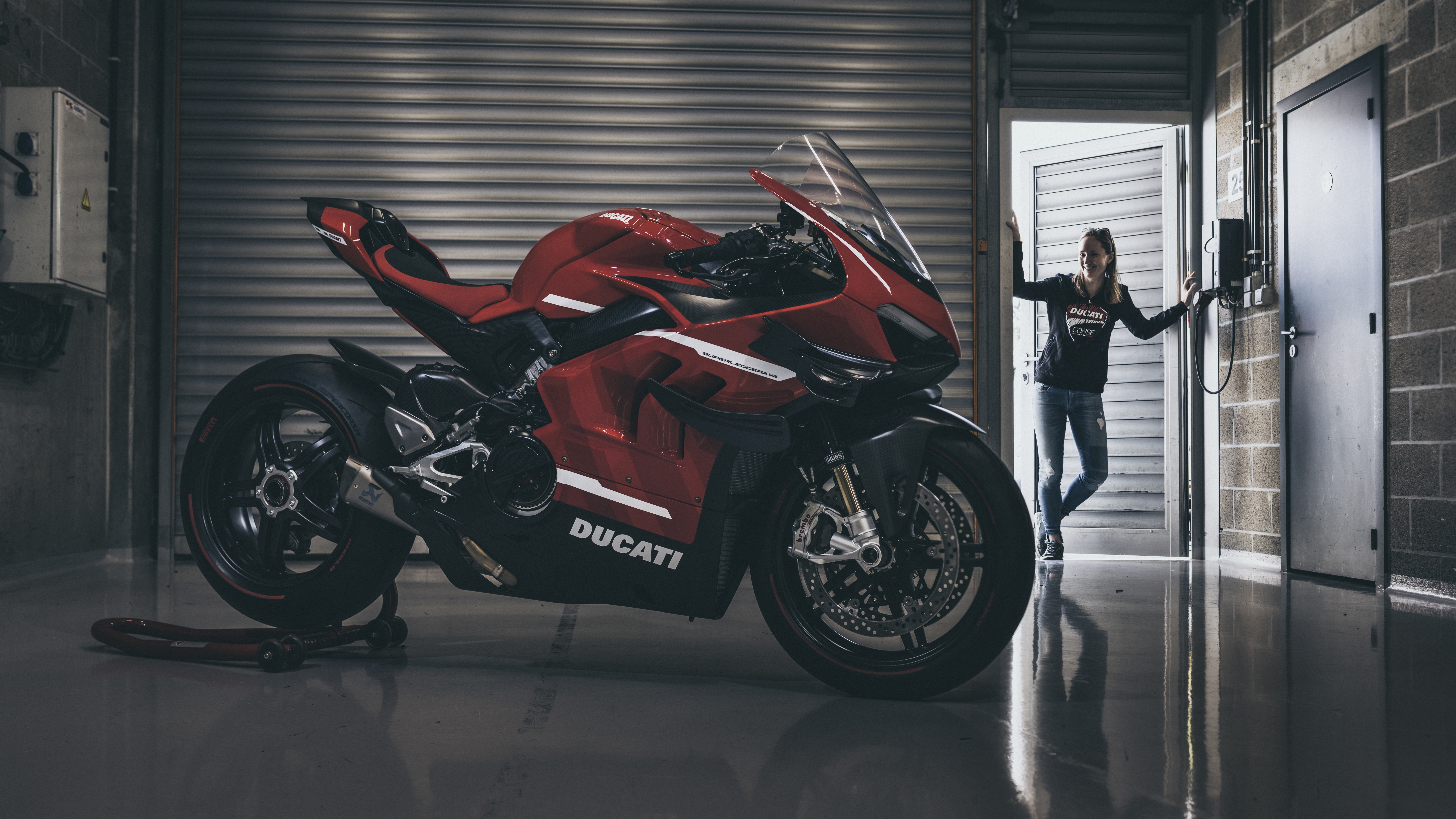 Description: A woman standing next to a red motorcycle in a garage with a woman standing next to it and a door.