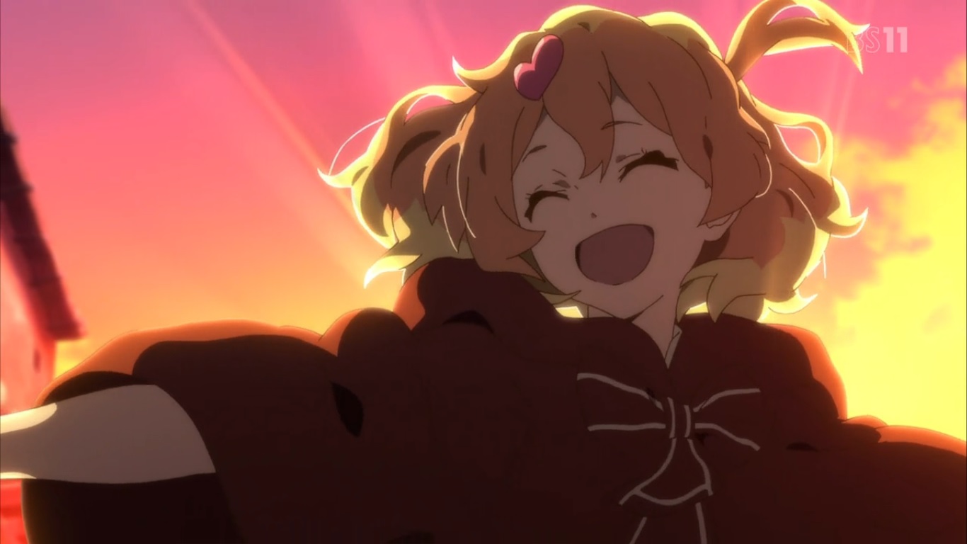 Description: A woman with her mouth open in front of a sunset background with a pink sky and clouds in the background.
