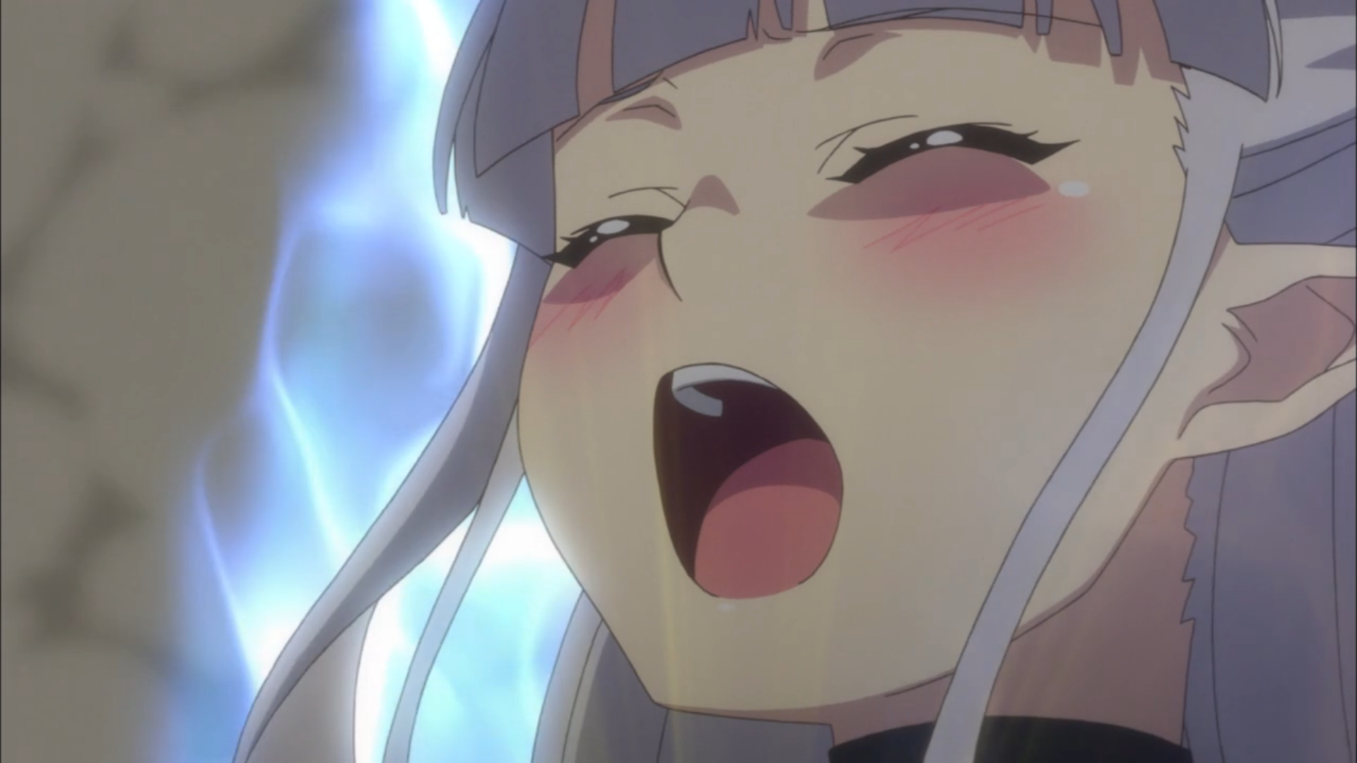 Description: A woman with her mouth open and her tongue out in front of her face and a blue background with a lightening effect.