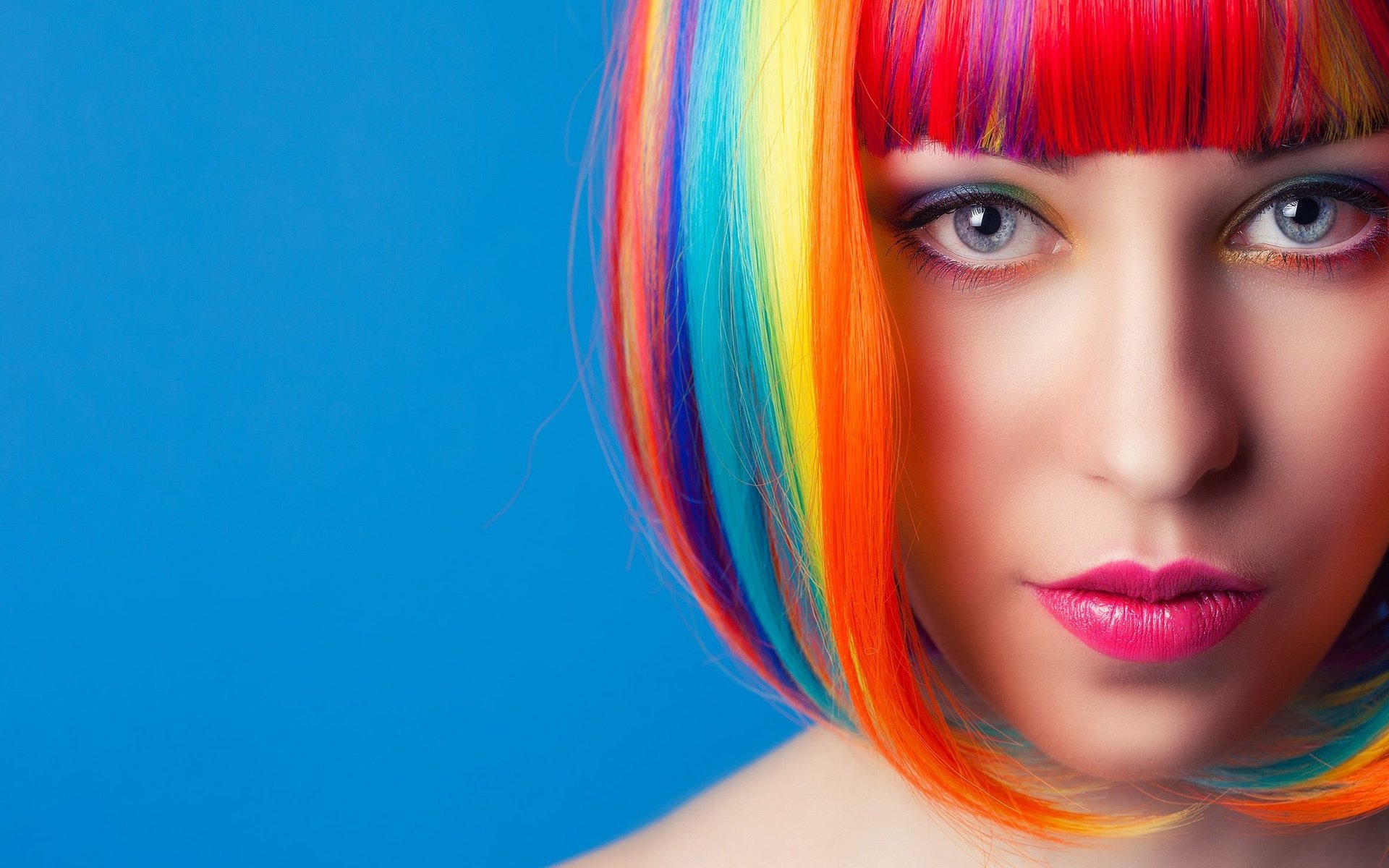 Description: A woman with multi colored hair and a pink lip and a blue background with a blue background and a blue background.
