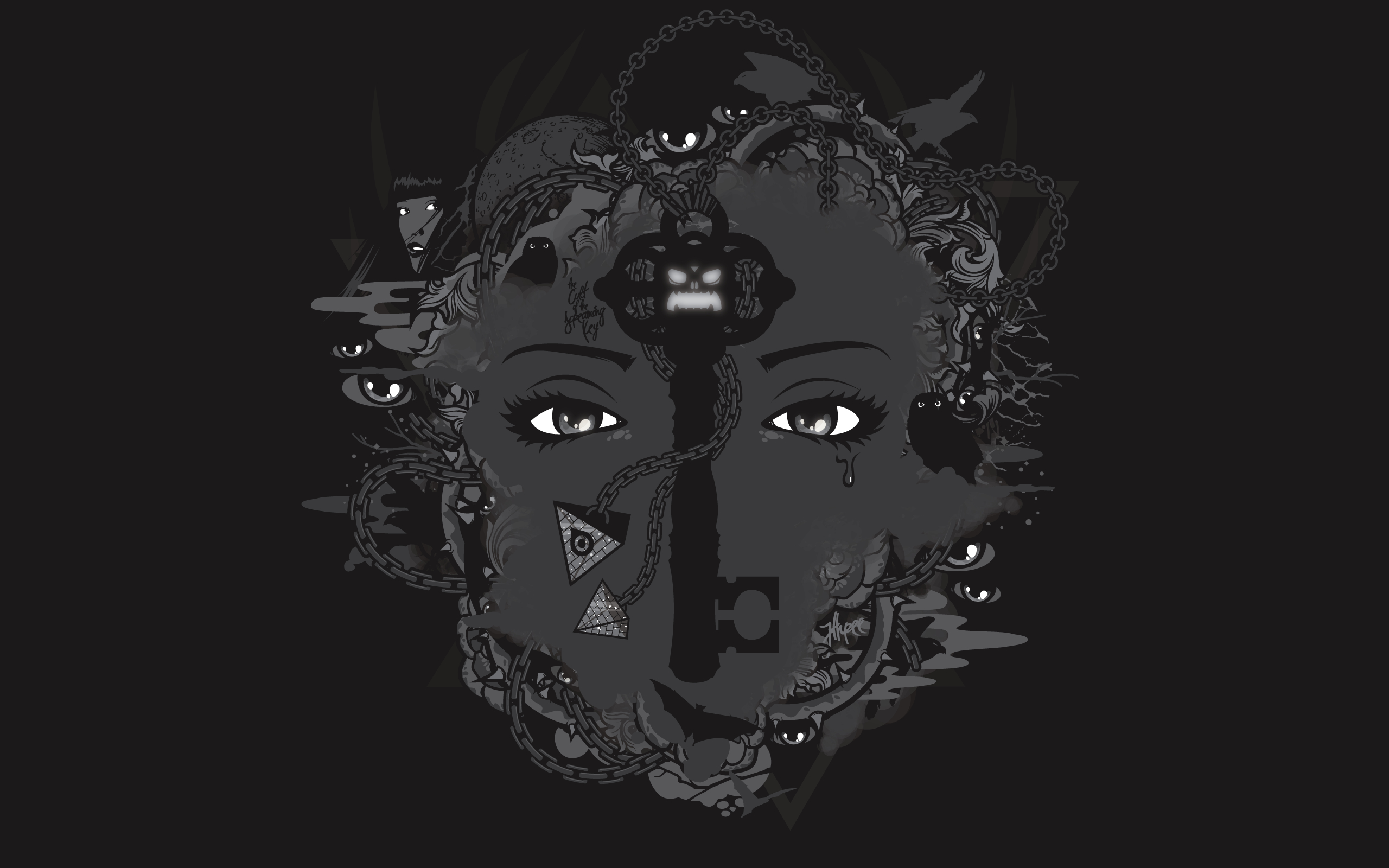 Description: A woman's face with many different eyes and a black background with a black background and a black background with a black background and white image of a woman's face.