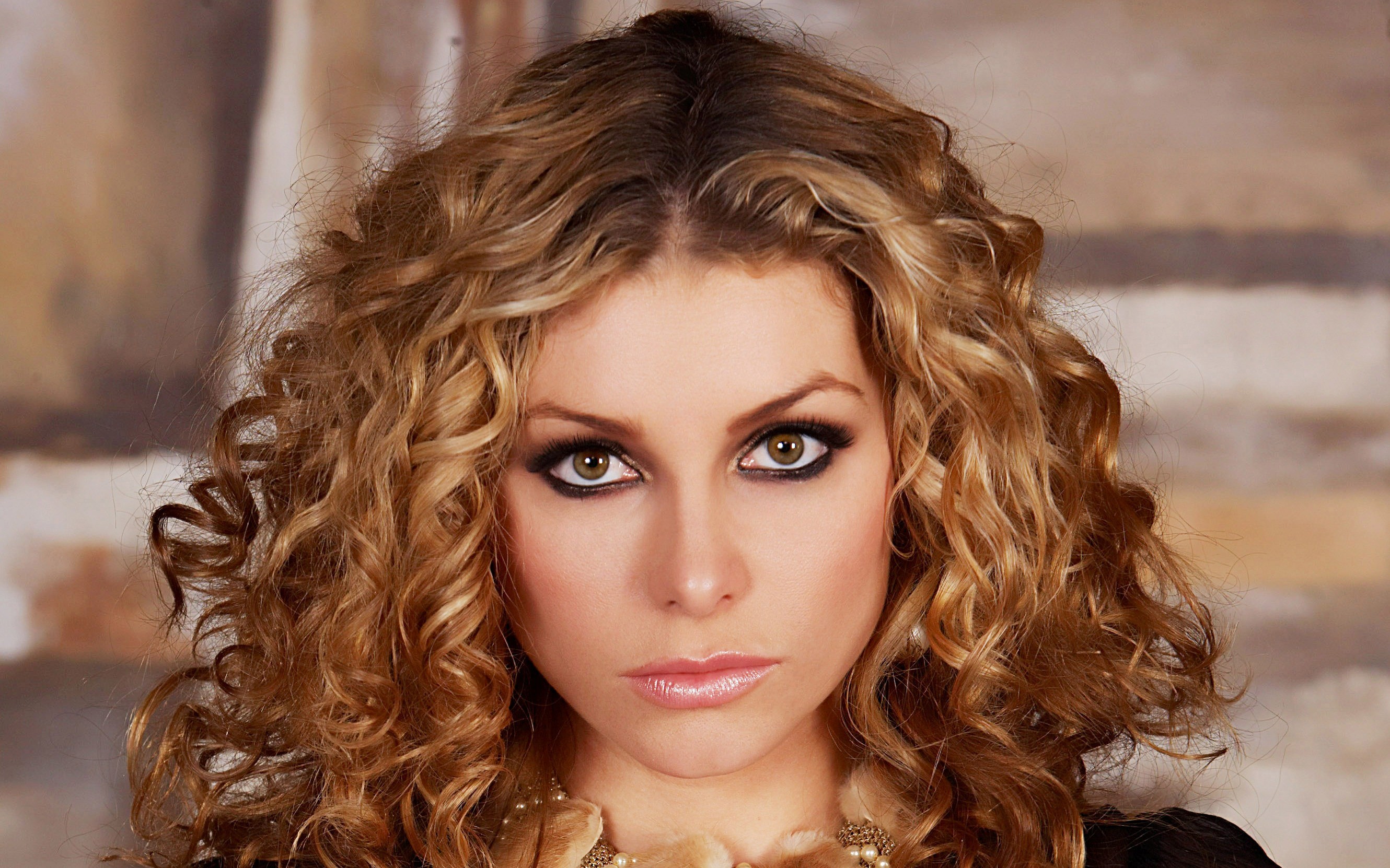 Description: A woman with a necklace and a black shirt on posing for a picture with a wall behind her and a painting behind her.