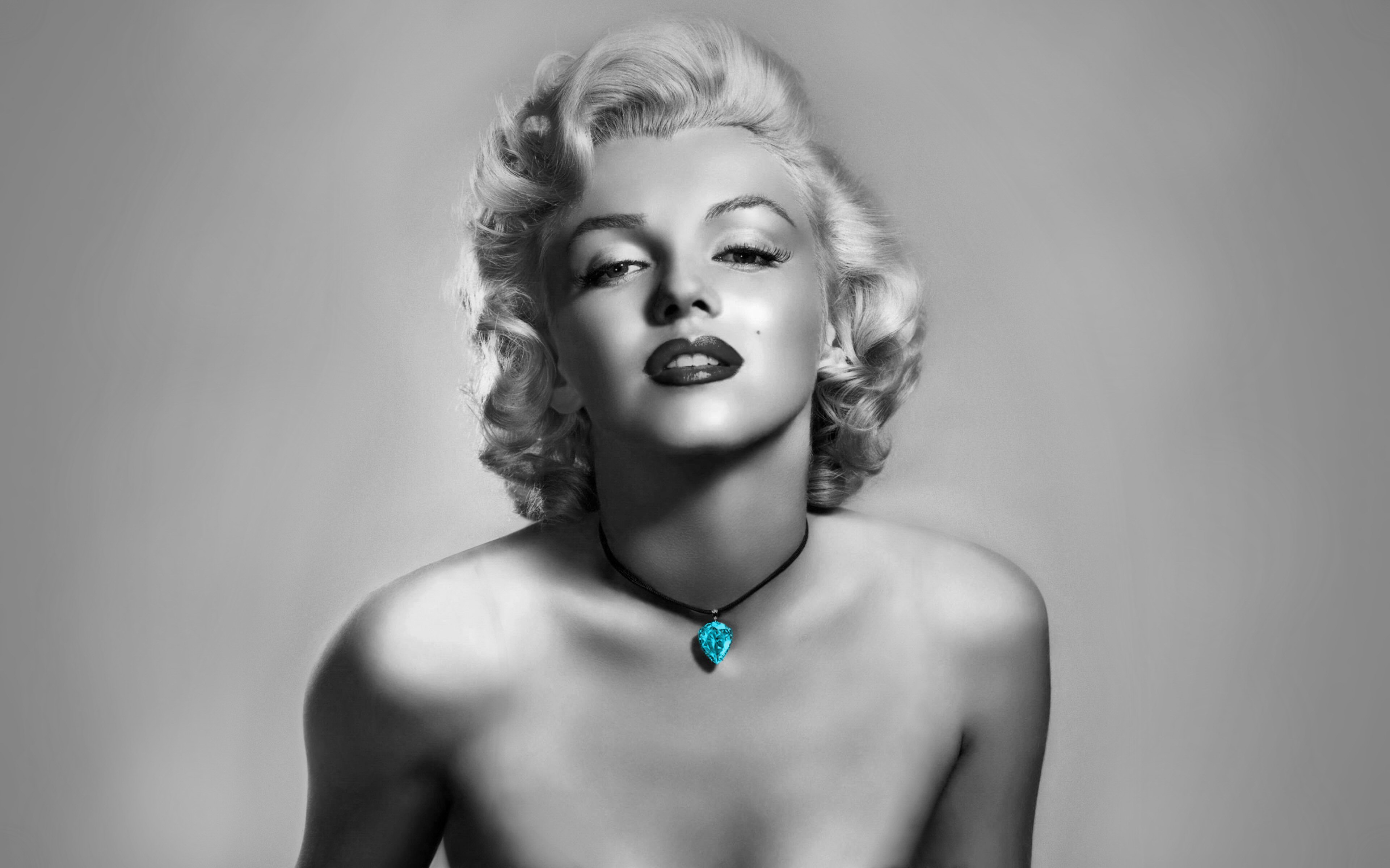 Description: A woman with a necklace on her neck and a blue stone in her mouth is posing for a picture.