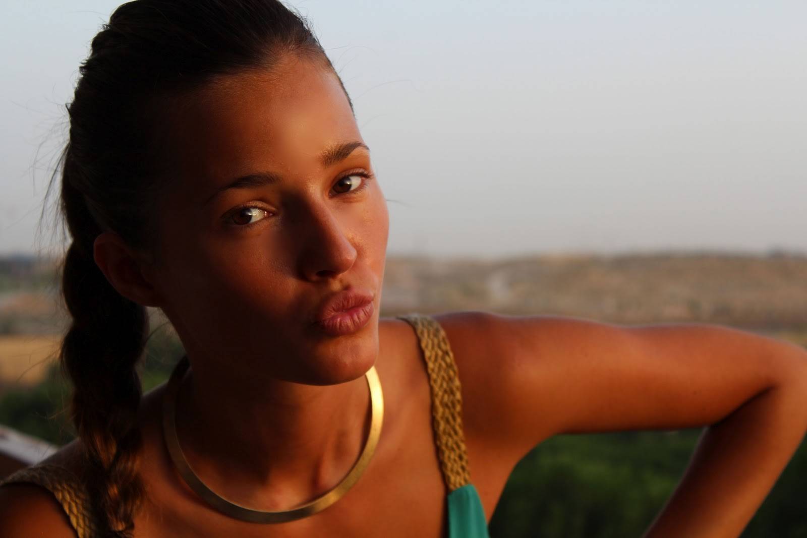 Description: A woman with a necklace on her neck looking at the camera with a city in the background and a hill in the distance.
