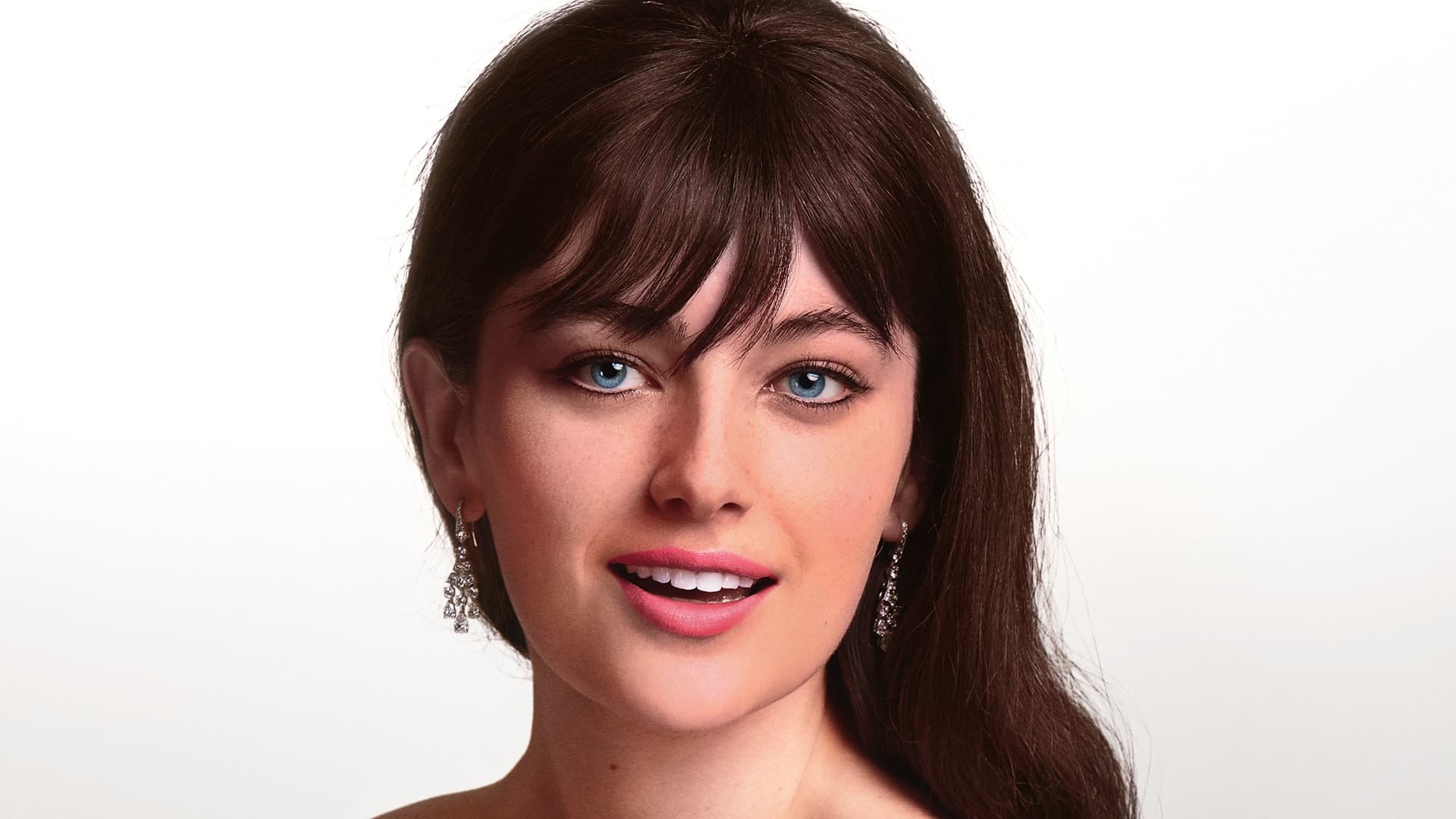 Description: A woman with a necklace and earrings on her neck posing for a picture with a white background and a white background.