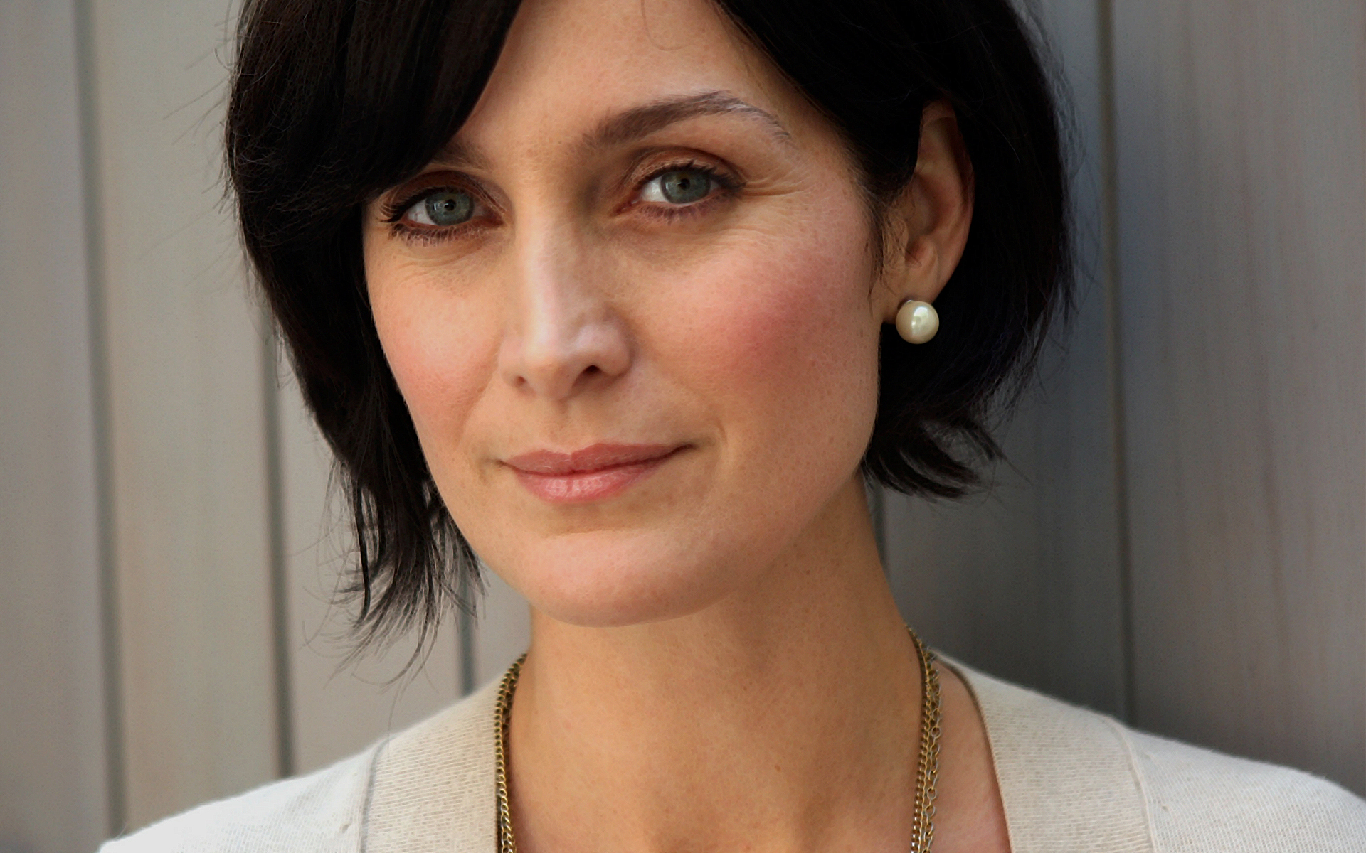 Description: A woman with a necklace and a pearl necklace on her neck and a white jacket on her shoulders and a gray wall behind her.