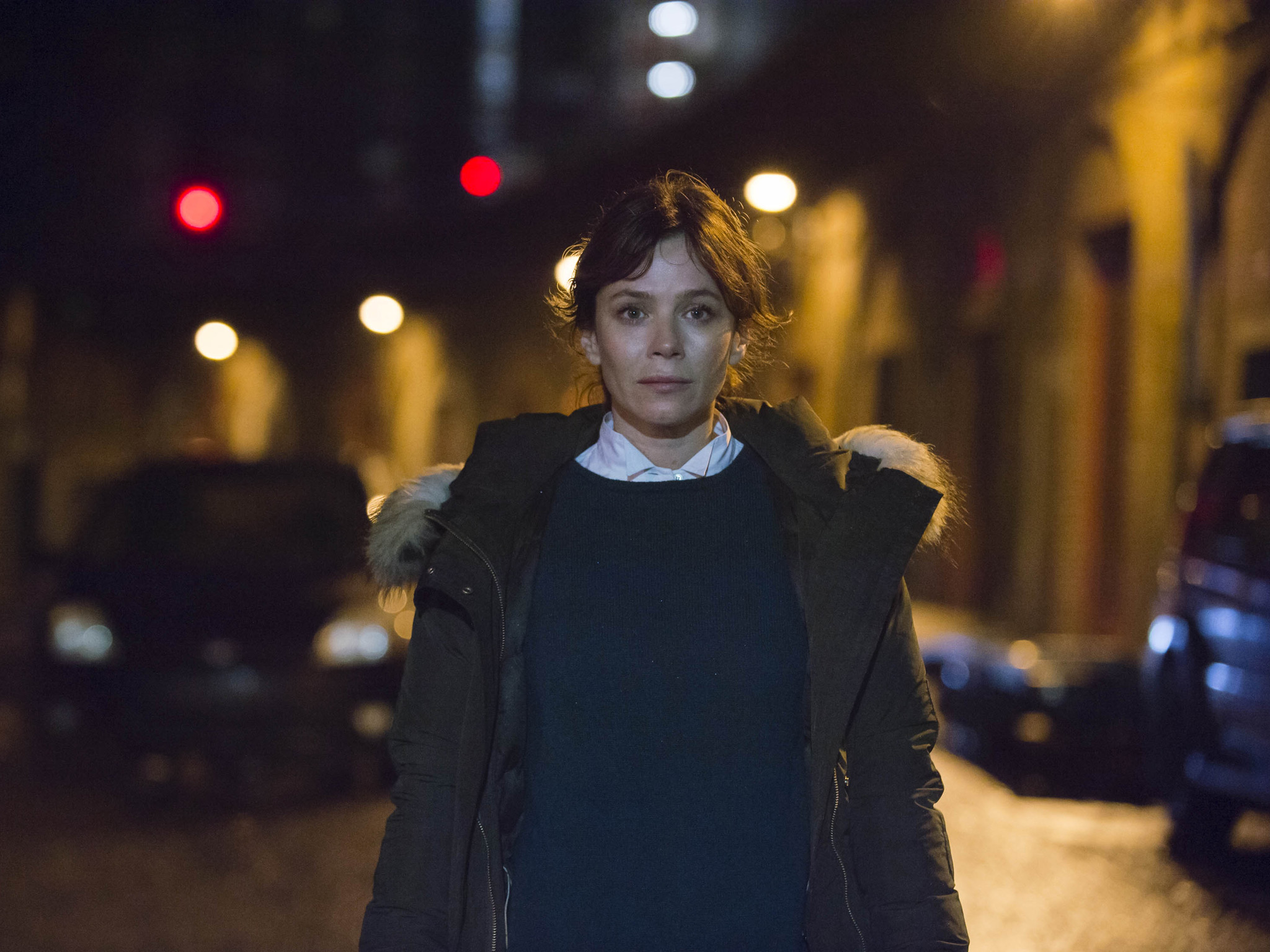 Description: A woman standing on a street at night with a car in the background and a red light in the distance.