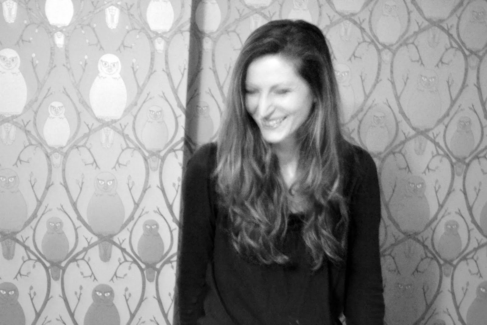 Description: A woman standing in front of a wall with owls on it's wallpapers and a phone.