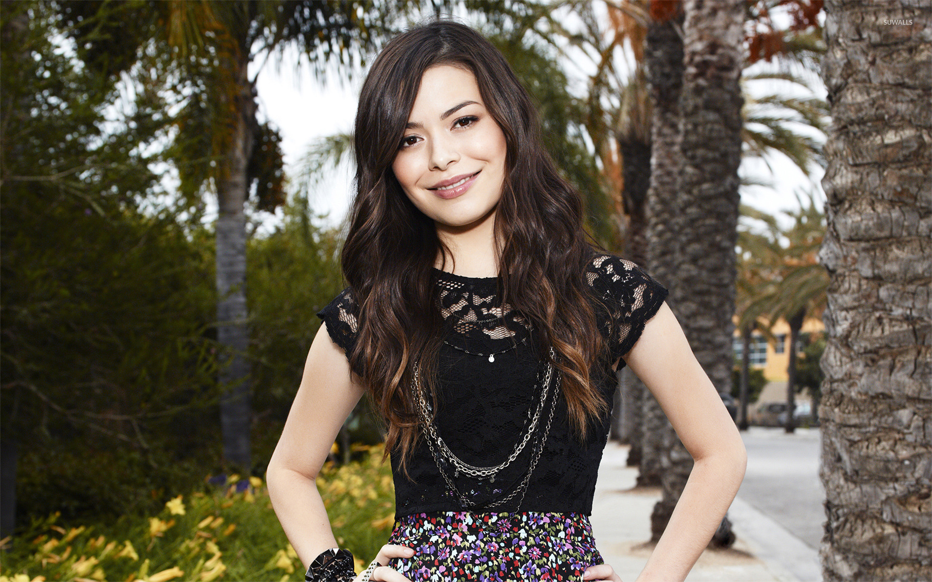 Description: A woman standing in front of a palm tree wearing a black top and colorful skirt with a lace top.
