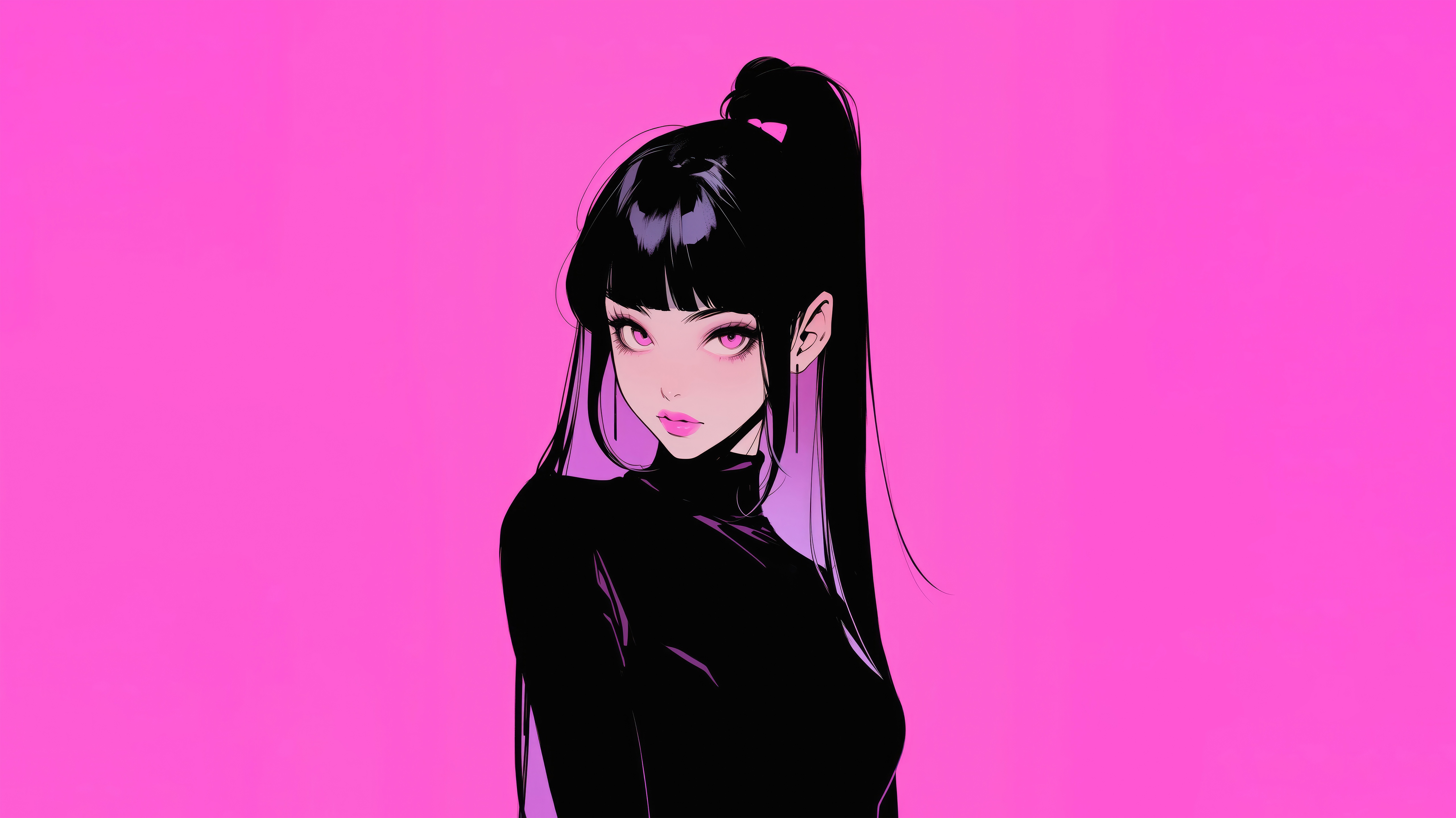 Description: A woman with a black shirt and a pink background with a pink background and a pink background with a black shirt and a pink background with a black top and white.